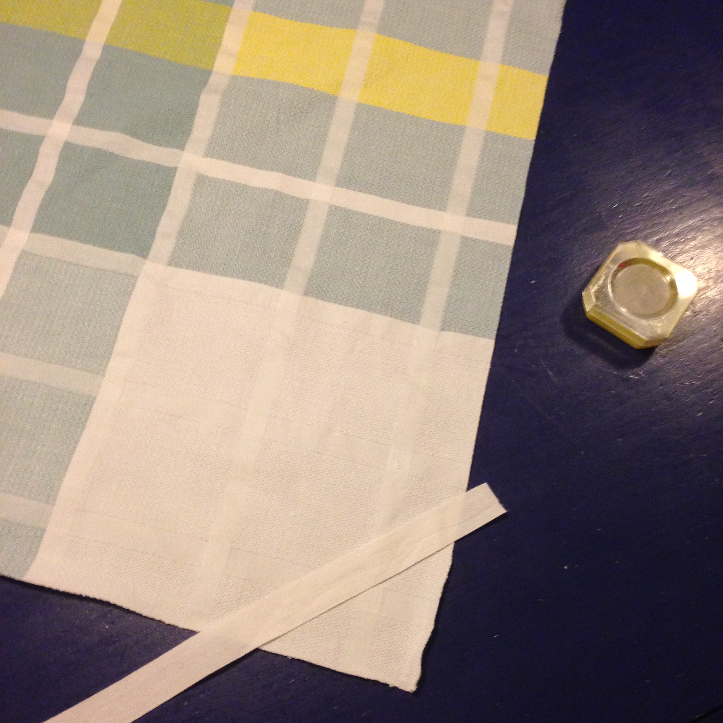 Det typiske viskestykke er aflangt, og der var nøjagtig stof til to aflange viskestykker i standardstørrelsen, når den blå dug blev klippet i to lige store stykker. Stroppen, som viskestykket hænges op i, er sat fast midt for på den lange side, da den blev foldet og syet.