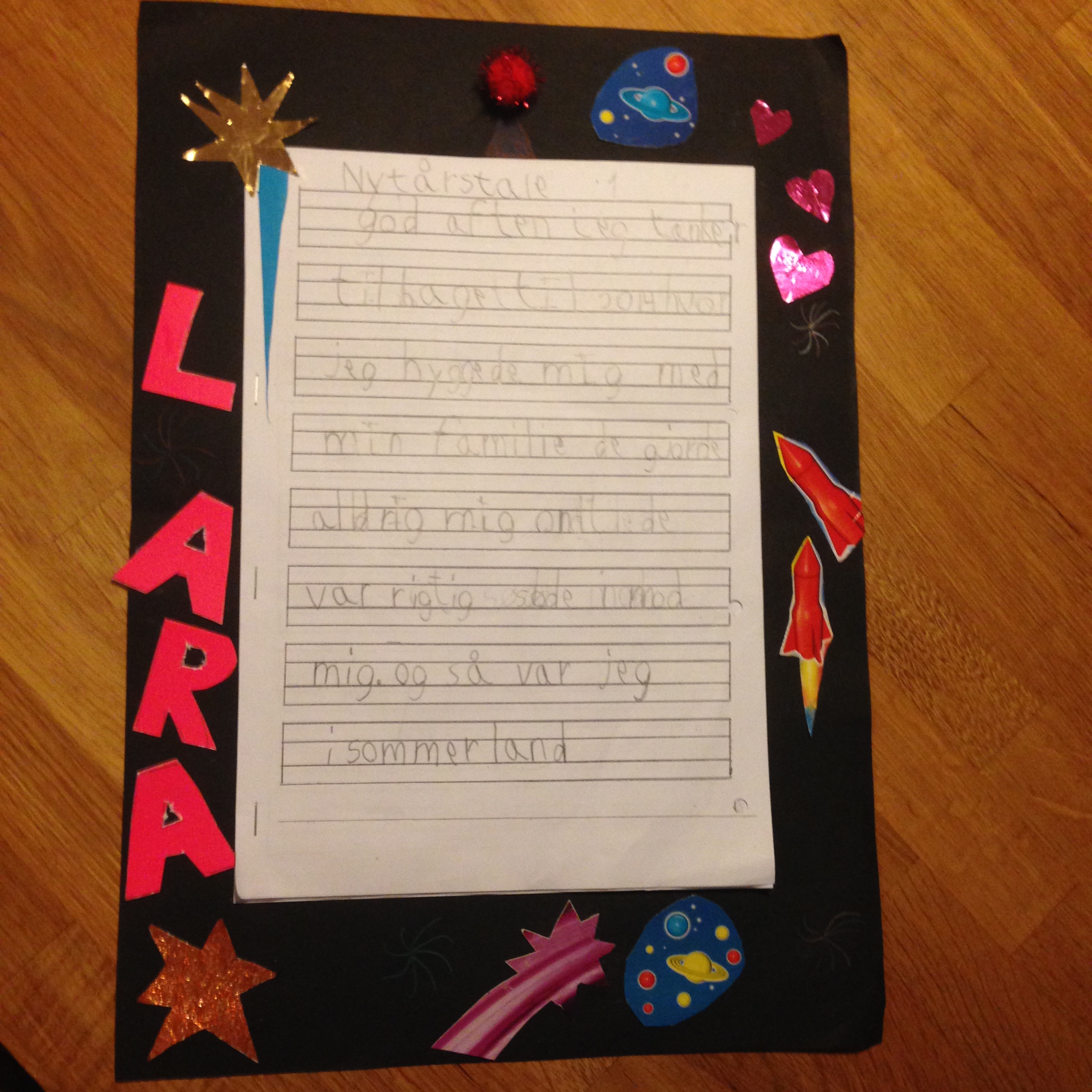 Hun havde også en skoleopgave – en nytårstale, der skulle dekoreres. Til dette formål er farverigt emballagepap og slikpapir helt perfekt.