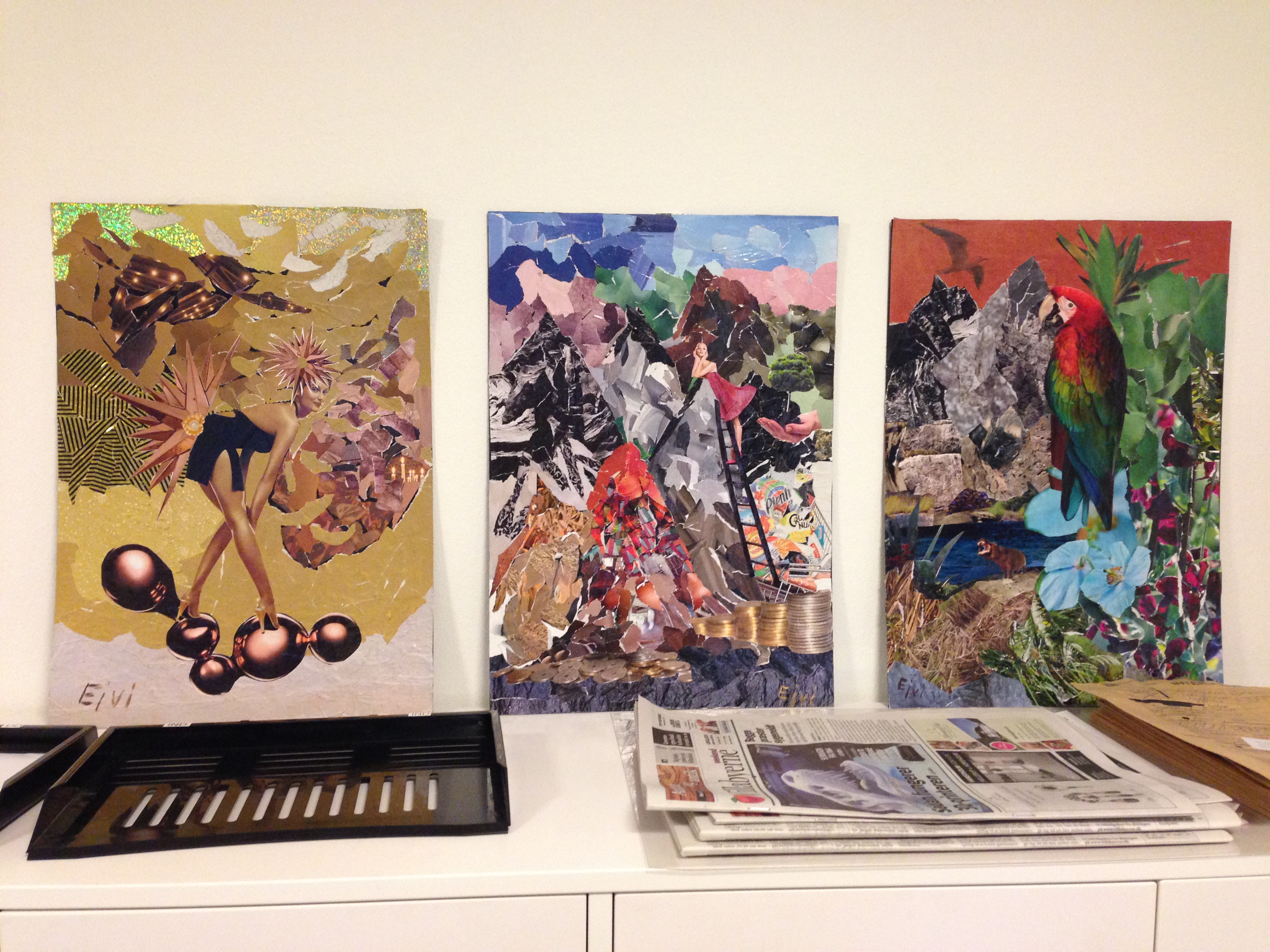 De tre billeder har været udstillet på mit arbejde. Papirstykkerne er sat på papplader, som oprindeligt er kasseret derfra, og jeg syntes, at det var sjovt at få dem tilbage på kontoret i en ny funktion. Her tog de sig også rigtig fint ud i kontorlandskabet.