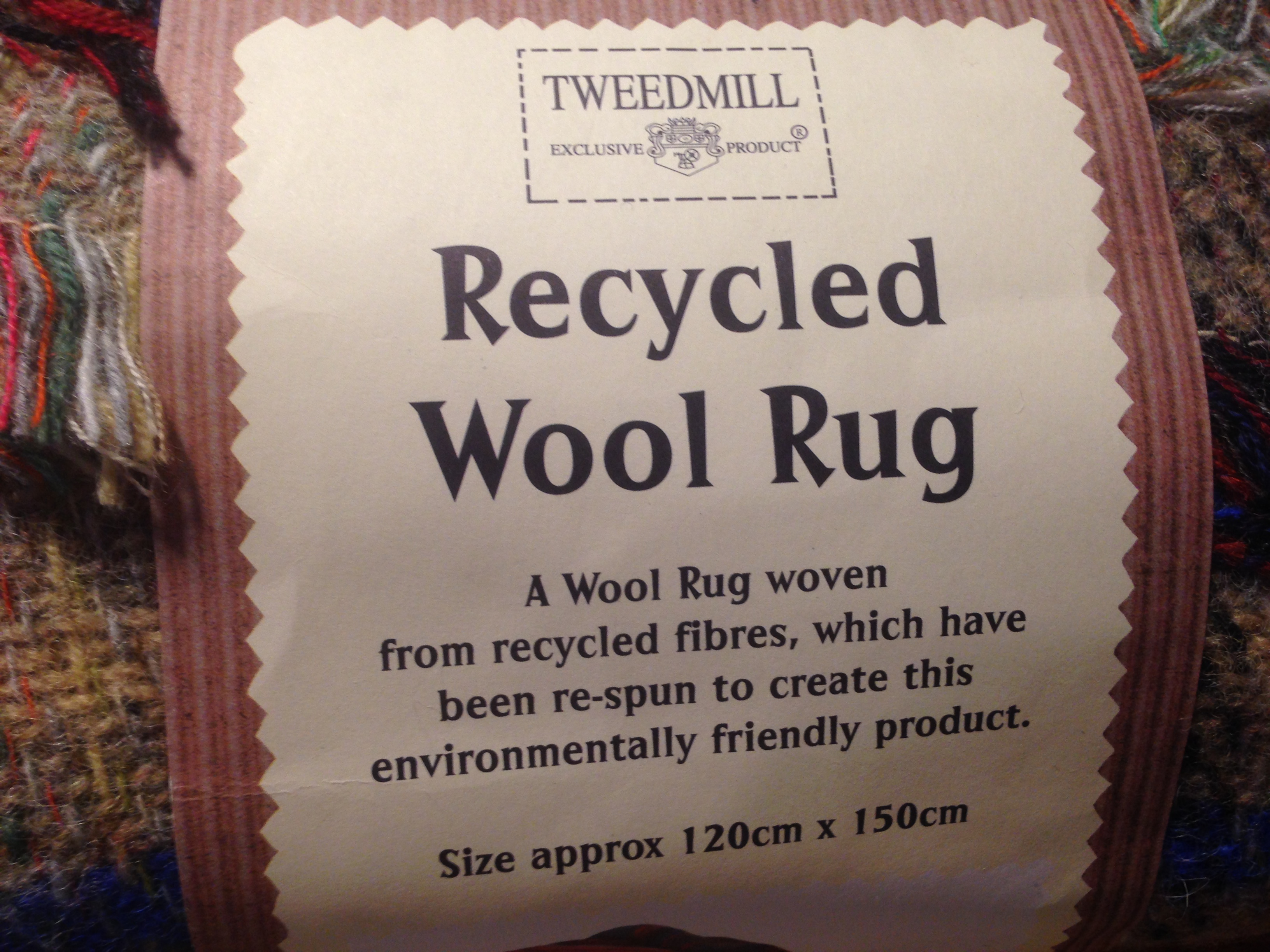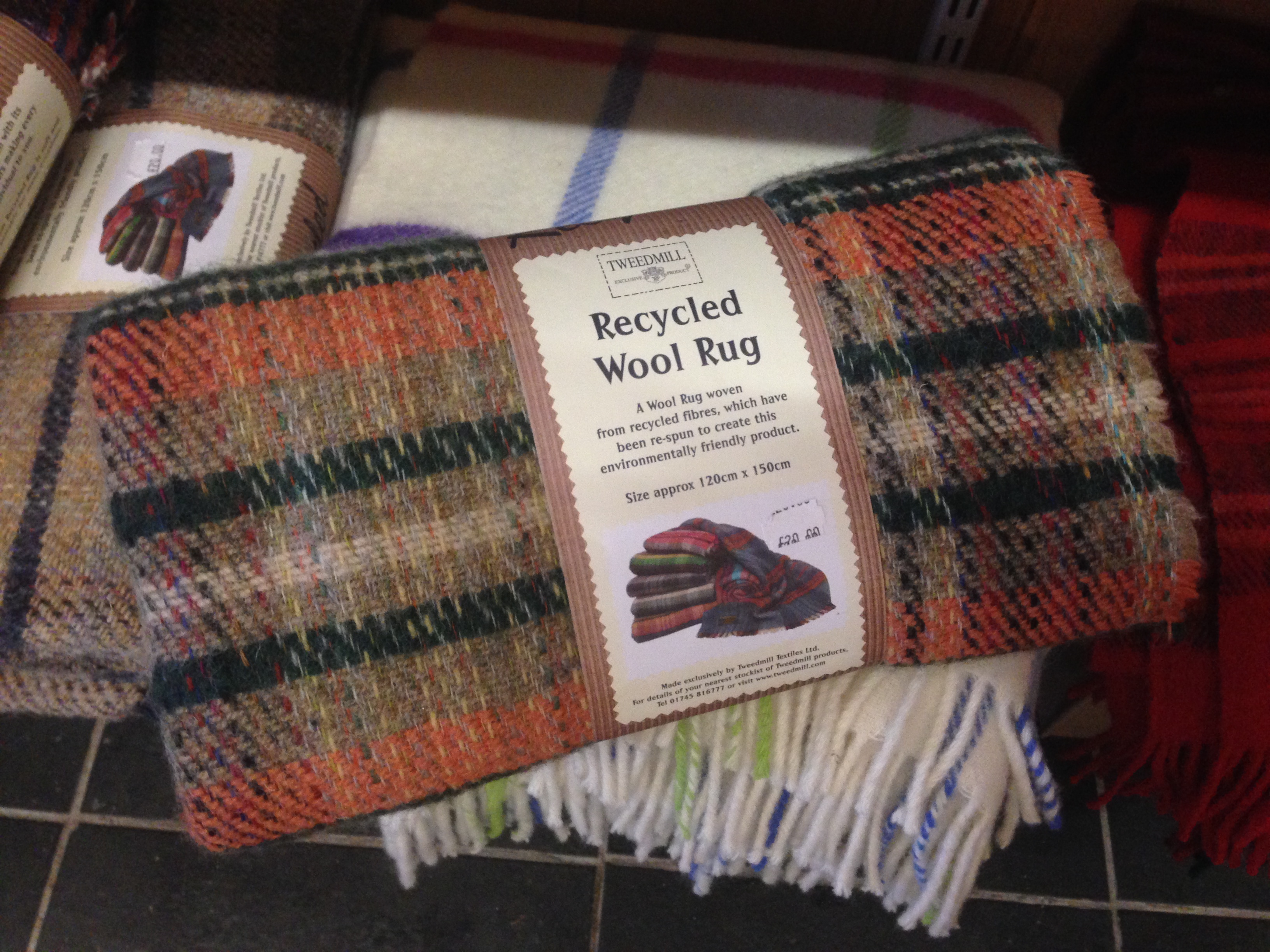 Til min store begejstring faldt jeg over noget, som jeg ikke havde turde håbe på – nemlig nye plaider af genbrugsuld. Sådan et tæppe af upcyclet uld måtte jeg bare støtte og eje. Det er groft vævet og lidt utydeligt i mønstret, men ret flot ellers.
