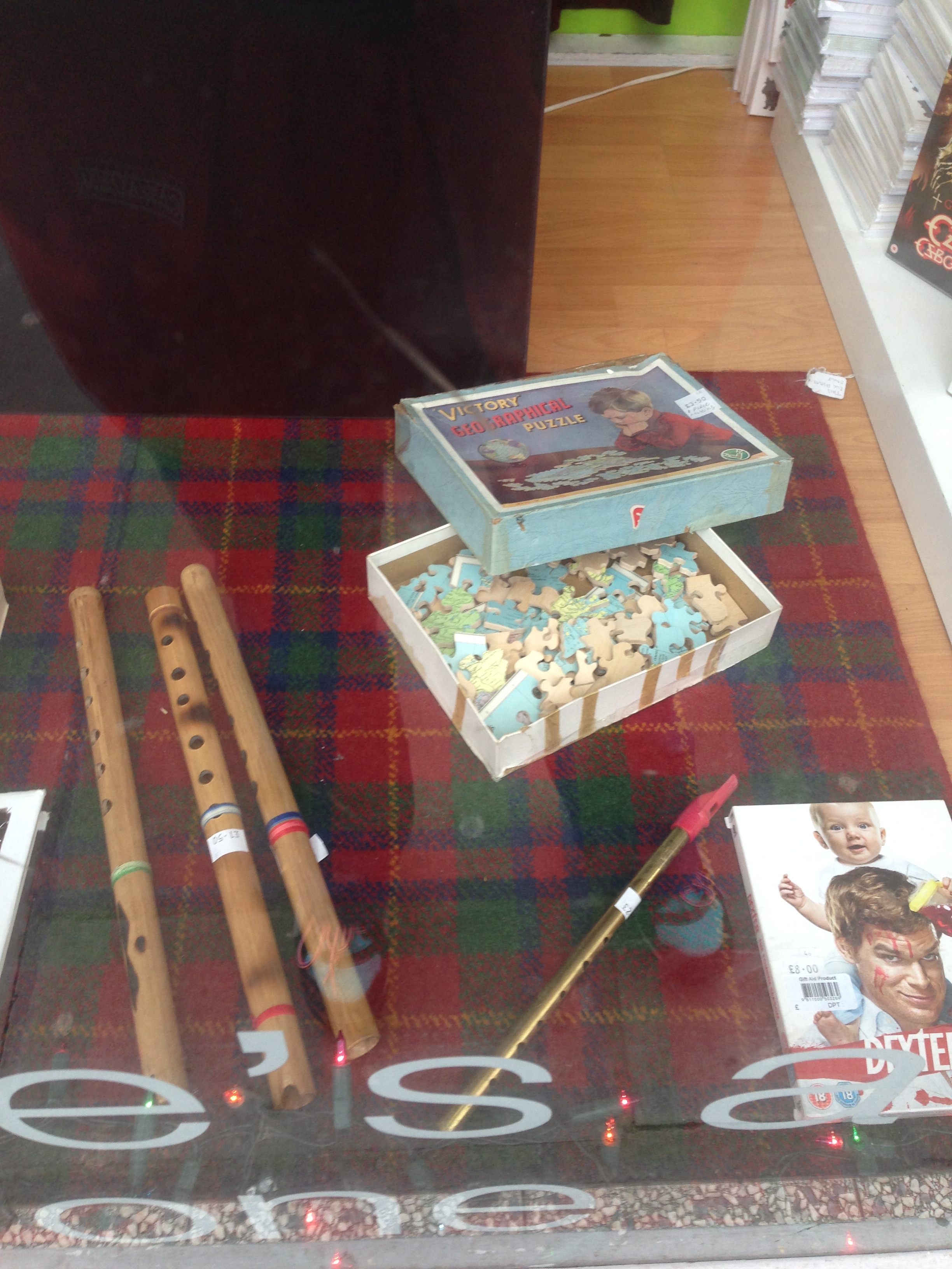 Butiksvinduet havde et mere bevidst retroudtryk. Se her med gamle fløjter og et træpudslespil med atlasmotiv.