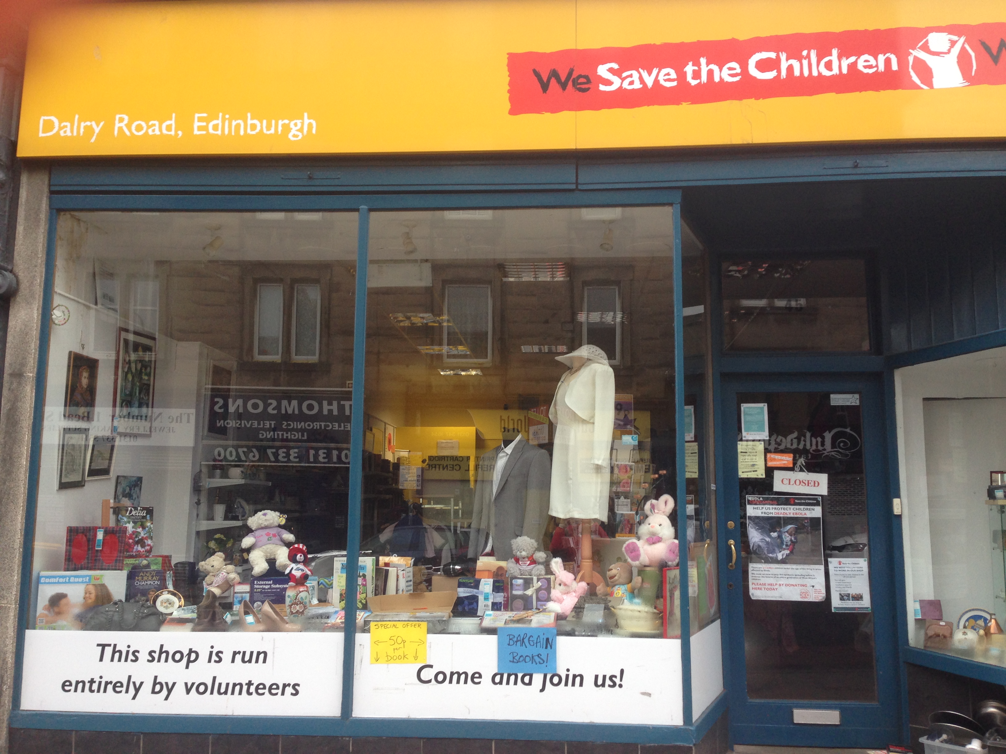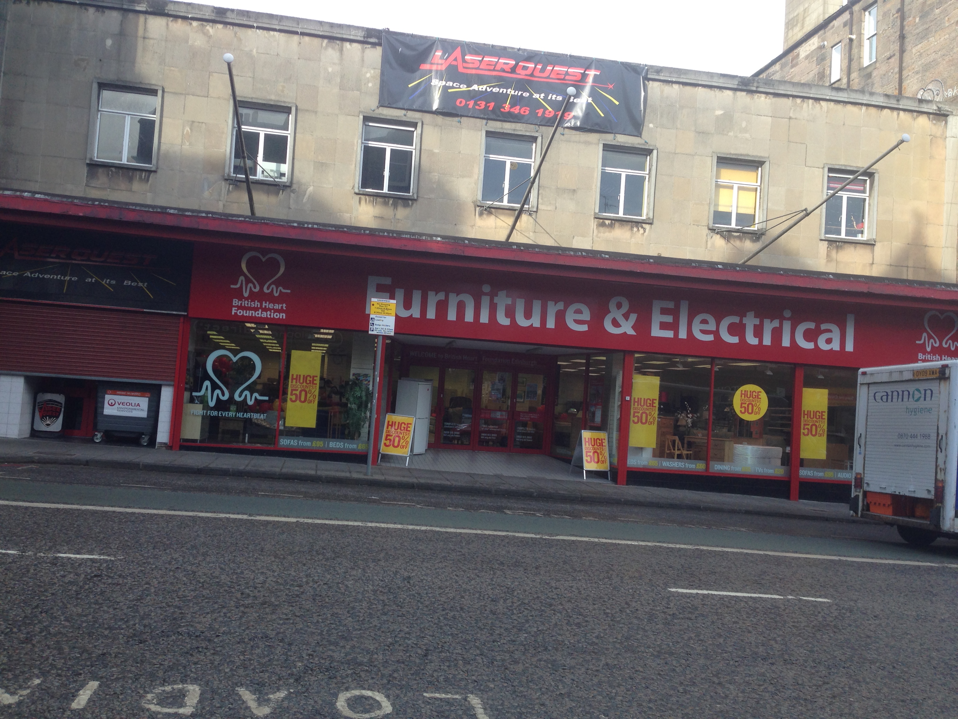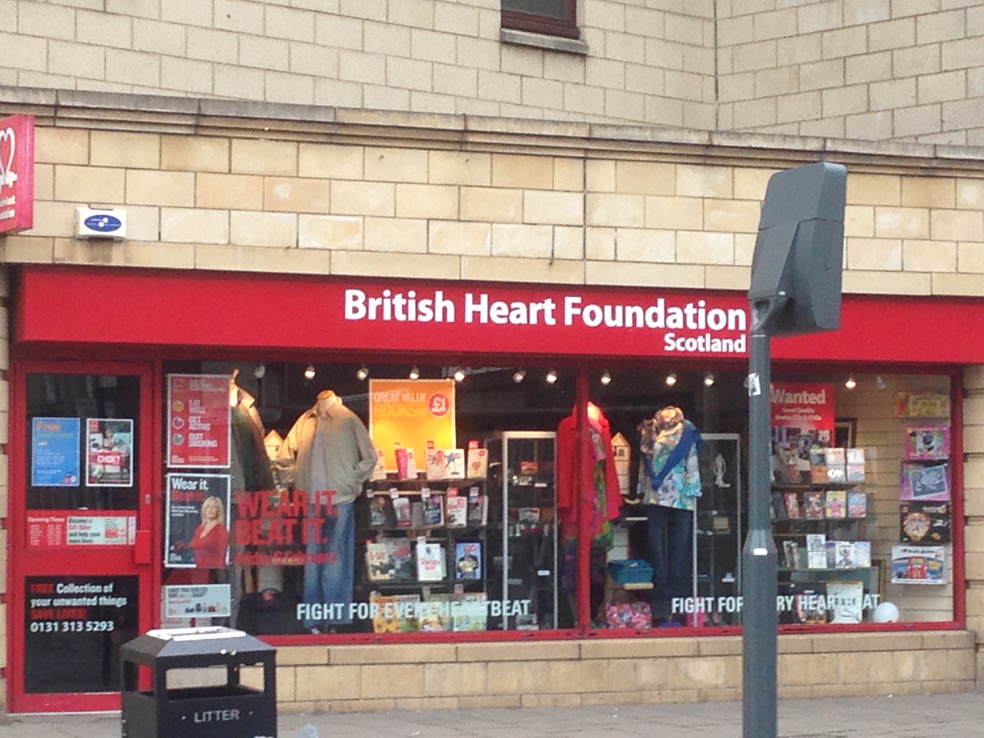 I nærheden af hvor vi boede ved Haymarket Station lå Dalry Road med hele fem genbrugsbutikker ejet af forskellige nødhjælpsorganisationer, blandt andet Frelsens Hær (Salvation Army). På Dalry Road tilbragte jeg sammen med pigerne mandag formiddag inden vores retur til København. De fire af butikkerne sælger ting og tøj, men der var også denne ‘British Heart Foundation’ butik med møbler og elektronik .