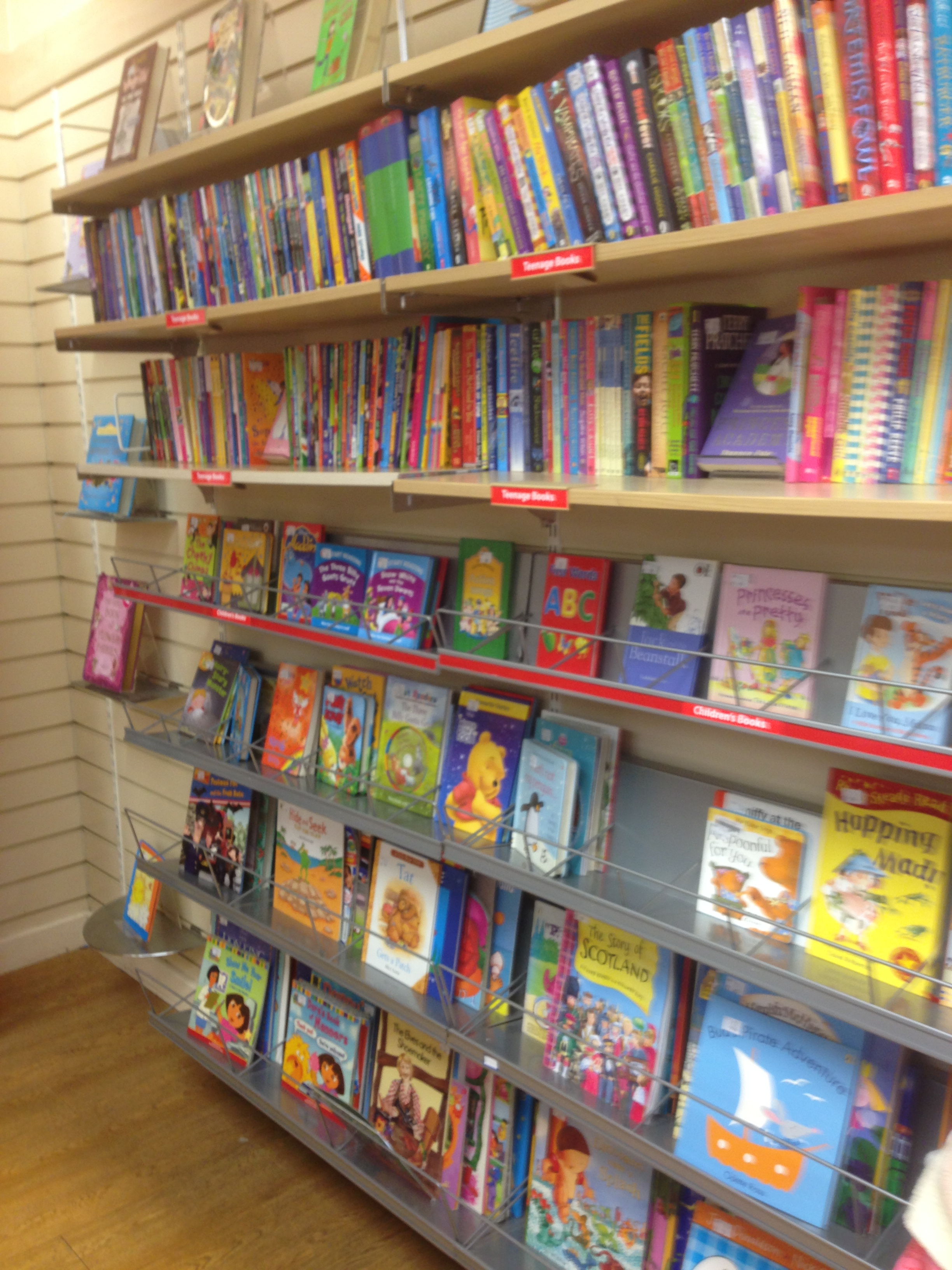 En butik, der er sirligt indrettet med en bogafdeling opdelt med havebøger, kogebøger og krimier. Hylder til legetøj og dametøj osv. Min datter på otte år fik fem engelske bøger med ‘Dora The Explorer’ og lillesøster en smart hårbøjle og hårspænder, begge dele var aldrig taget i brug. Her er børneboghylden.