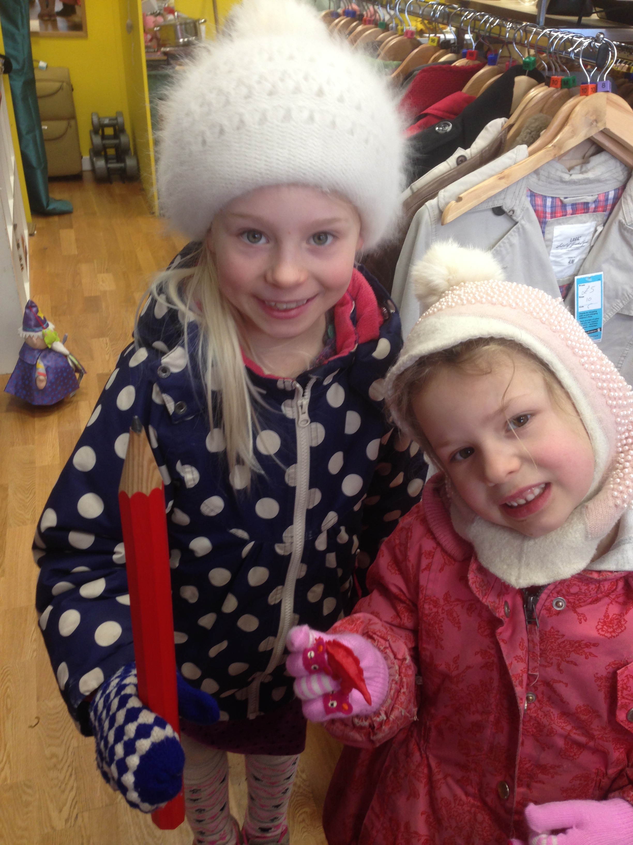 Den ældre dame i butikken forærede pigerne en lille ting hver. Ja, den ene ting var i hvert fald lille, nemlig en lille plastik dinosaur. Den anden var en kæmpe blyant, som min ældste datter blev meget glad for, og vi uden problemer også fik med hjem i håndbaggagen – Pyha!