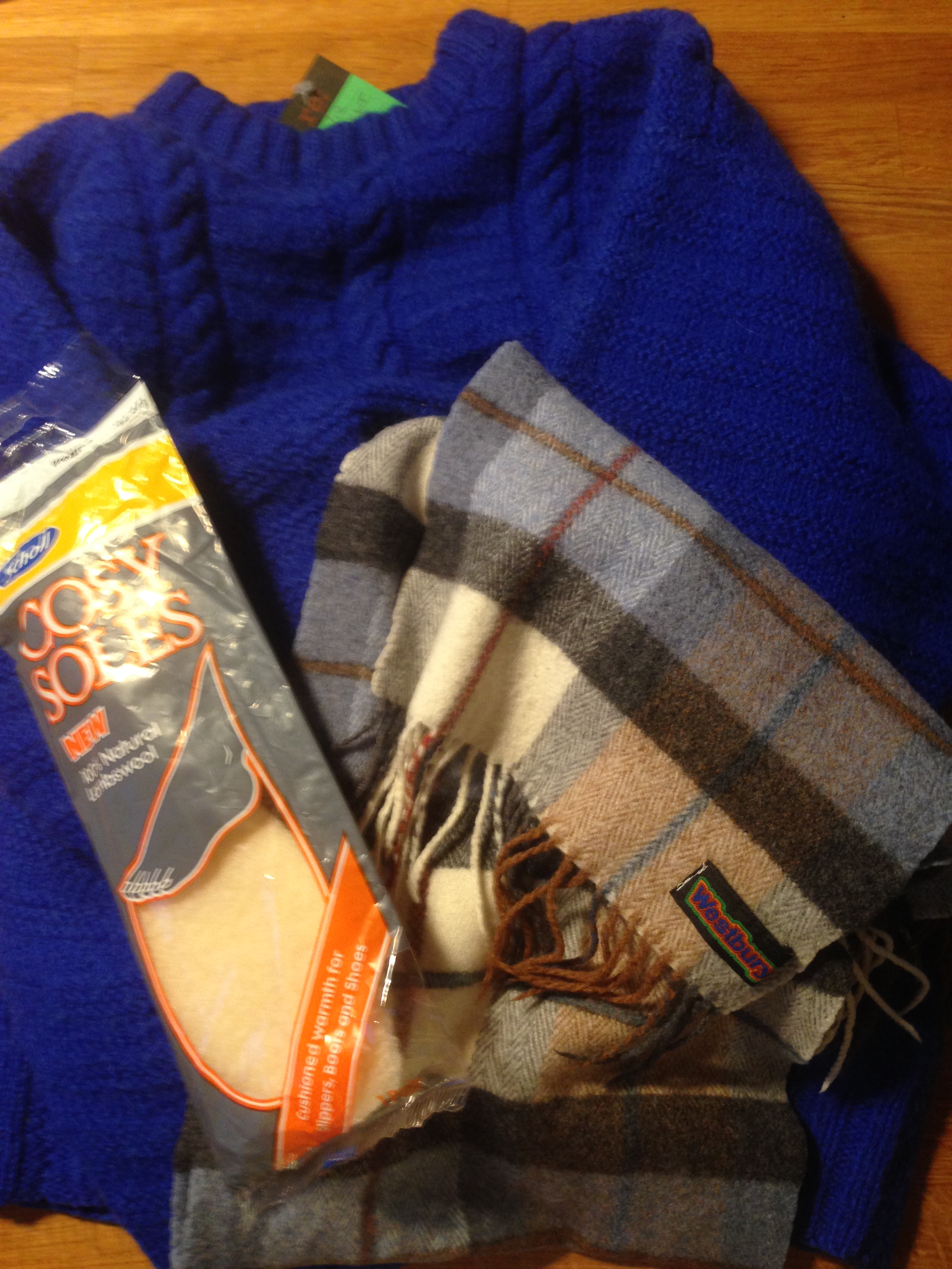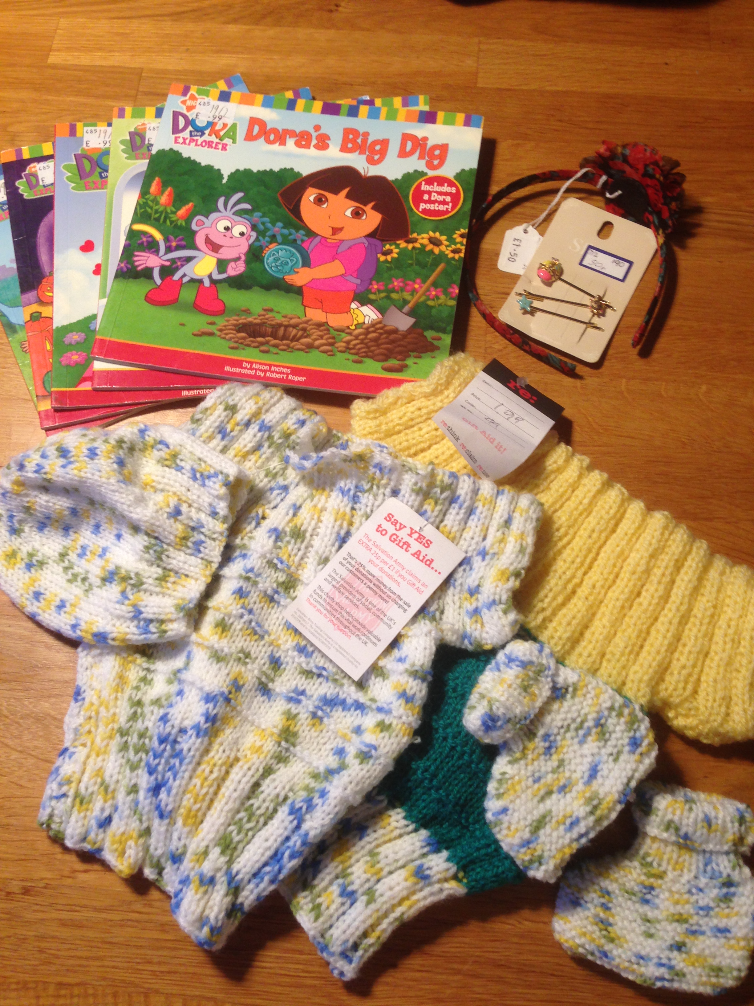 Vi var blandt andet på udkig efter uldtørklæder og plaider, som er typiske for Skotland, men fandt desværre forsvindende lidt af den slags i Dalry Roads genbrugsbutikker. Det eneste sted, hvor vi havde held med at finde et pænt tørklæde samt et par uldindlæg til sko (stadig i emballage) og en ulden sweater, var i Salvation Armys butik på modsatte side af gaden. Denne butik er meget rodet med tøj og ting fra gulv til loft. Pigerne fandt også noget hjemmestikket bamsetøj, så der var også lidt med hjem til bamserne derhjemme.