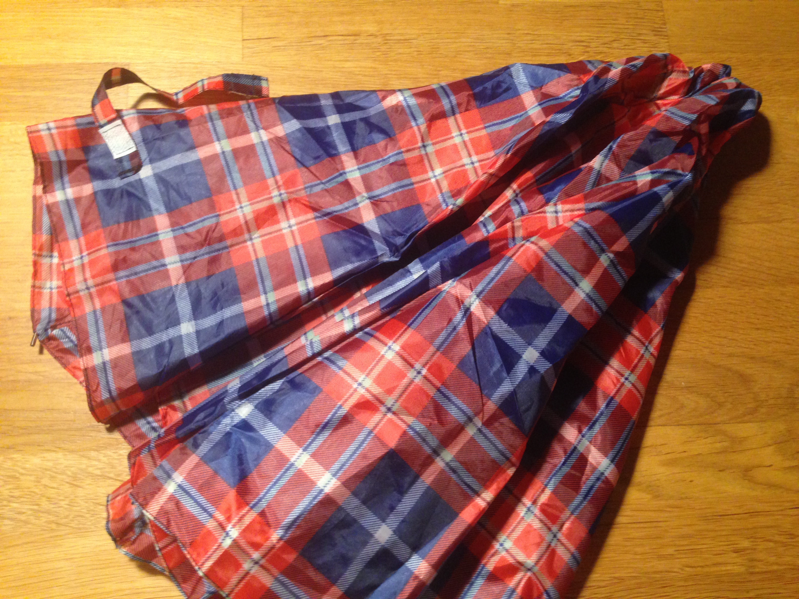 Min mand var meget forarget, da jeg hev betrækket af en paraply, som lå i en affaldsspand. Det faldt ham ikke ind at blive forarget over, at et ret så stort stykke metal, altså paraplyens stativ, var smidt til forbrænding??? Nå, hver sin affaldslogik. Paraplybetrækket er selvfølgelig skotskternet og skal sys om til f.eks. et indkøbsnet, nu må vi se.