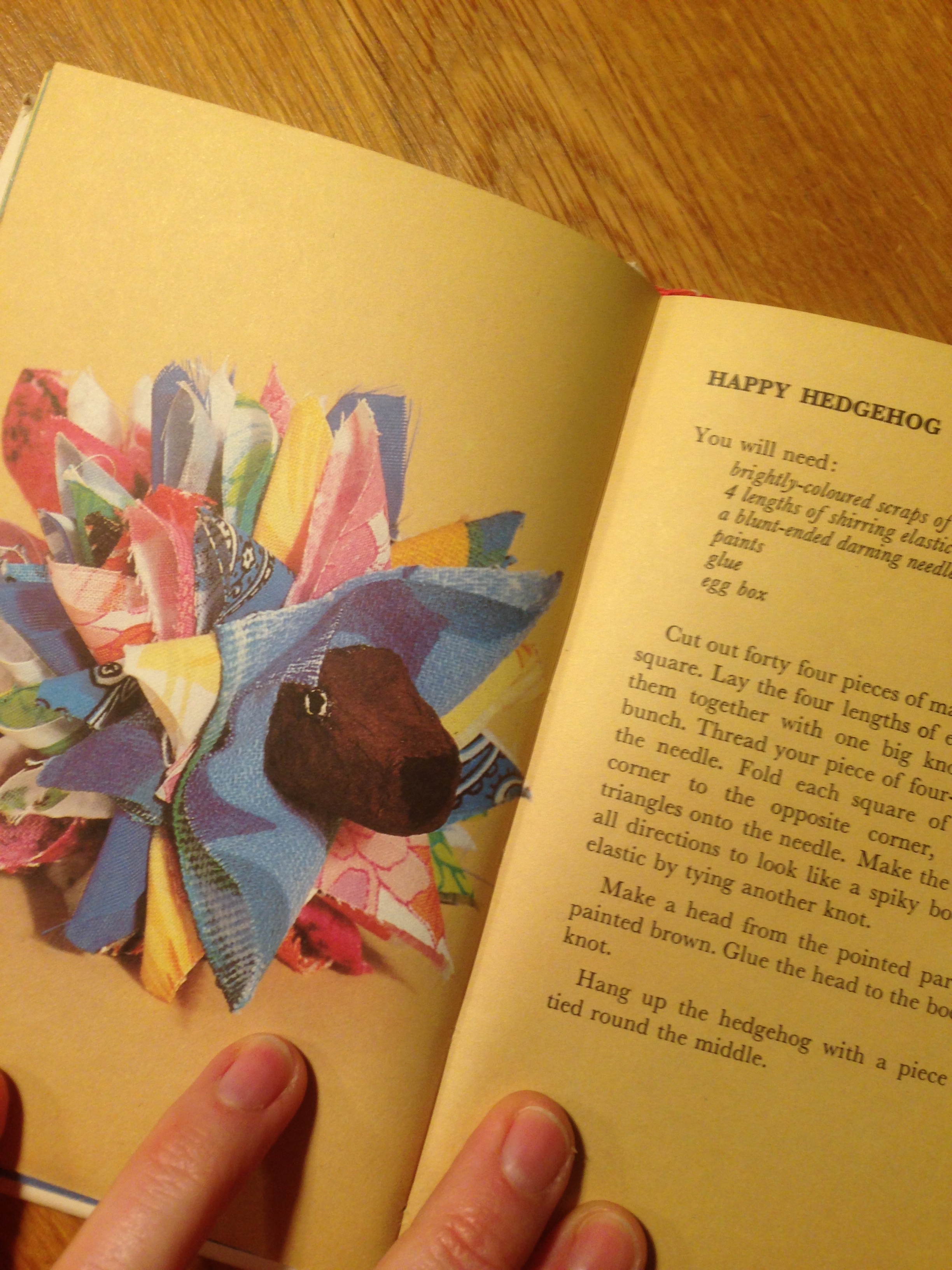 Bogen har et meget enkelt og uskyldigt (70’er) layout, og det var nok mest derfor, at jeg faldt for den. Her et pindsvin lavet i stofrester og æggebakker.