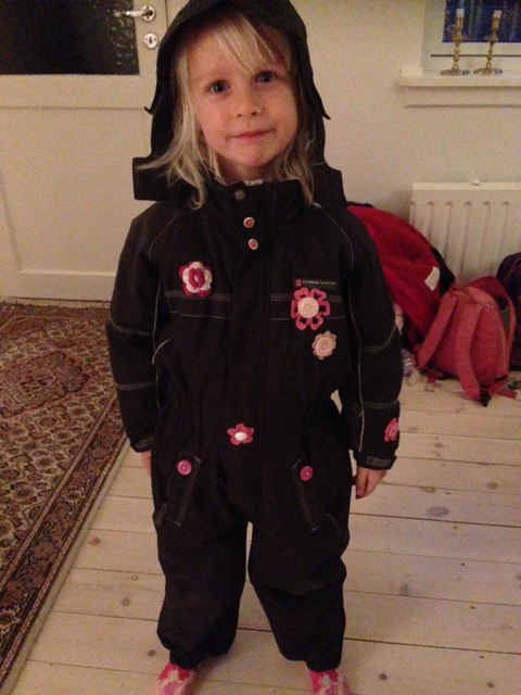 Min veninde, der arvede en drengeflyverdragt, fandt på noget ret smart, for at få datteren i den. Se her, hvordan hun har syet hæklede blomster og lyserøde knapper på.