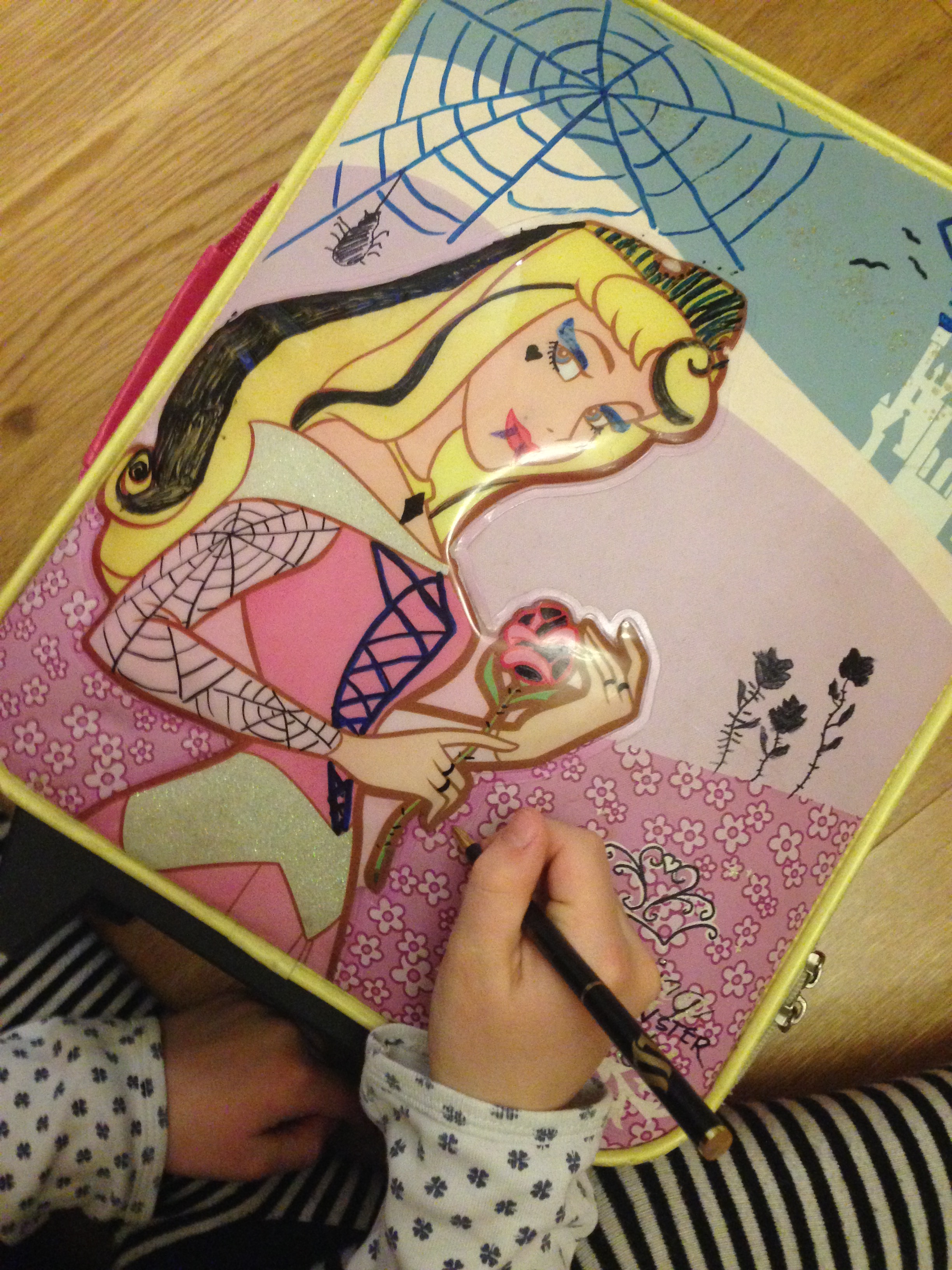 Kufferten fejler intet, så i stedet for at købe en ny, foreslog jeg, at vi gav den en monster-makeover. Og se lige, hvor fæl og monstercool Tornerose er blevet med hugtænder og sorte highlights i de gyldne lokker.