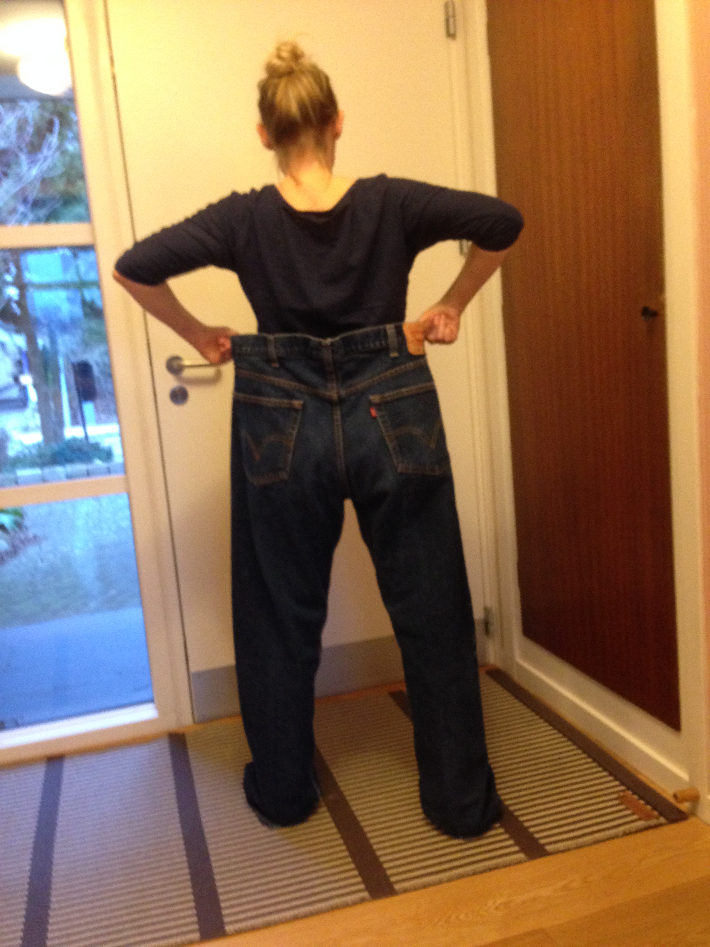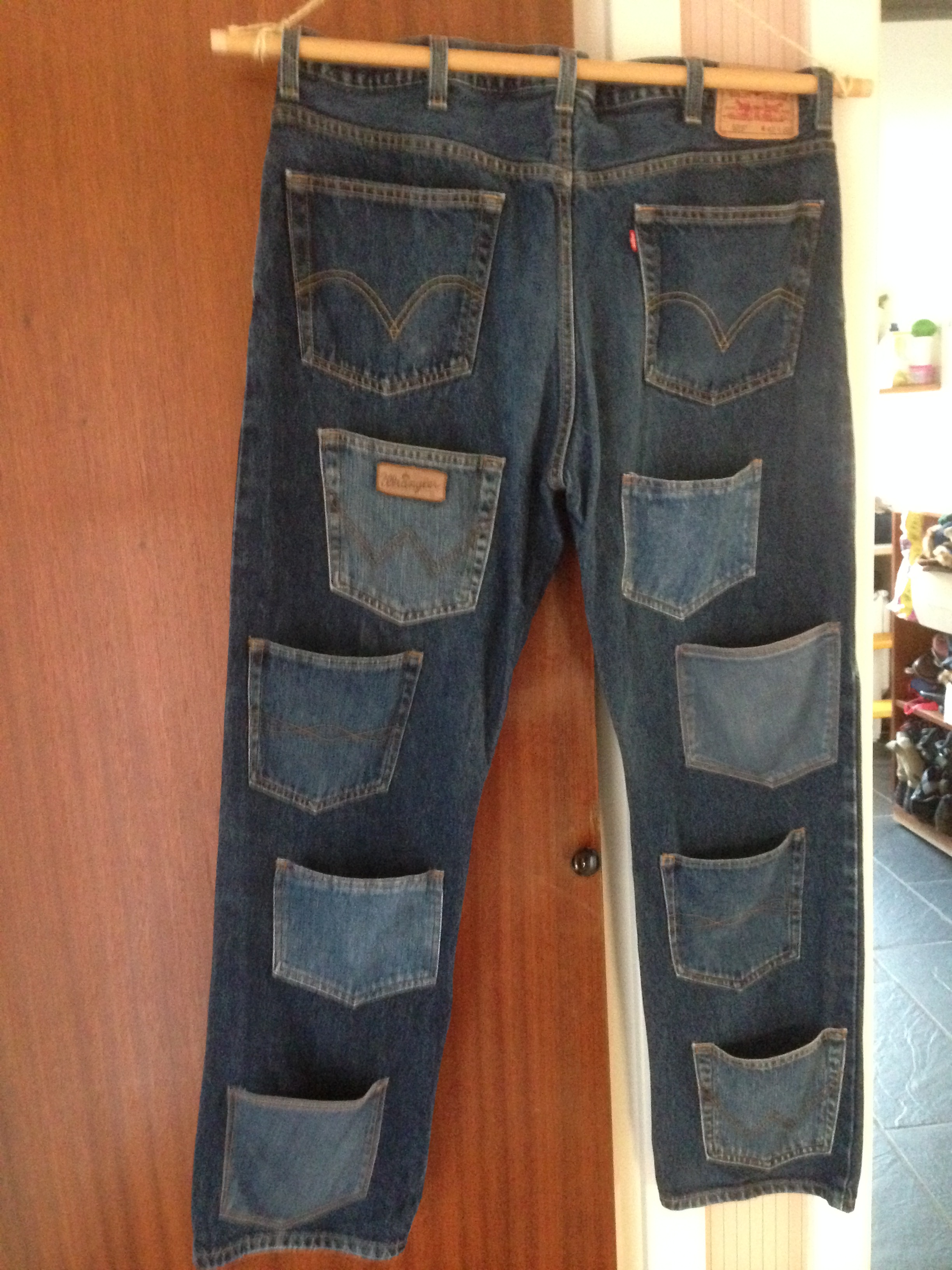 Jeg havde flere brugte cowboybukser på lager, hvorfra jeg har brugt lommerne, men jeg har også fundet flere par herrecowboybukser (med store lommer) i en genbrugsbutik til formålet. Træpinden bukserne hænger på er tremmen fra en tremmeseng.