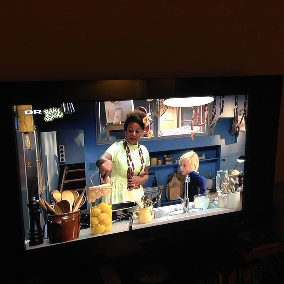 Jeg har blandt andet fået inspiration til pølserækken fra mit yndlings børneprogram ‘Køkkenhyggen Hella’, hvor Hella Joof laver mad med børn. Programmet er helt fantastisk, både fordi der laves sunde gammeldags madretter med gode råvarer, men også på grund af indretningen af Hellas køkken med masser af genbrug og retro køkkenværktøj. Her får du lige et skærmbilled-billed, der viser Hella iført pølserække.