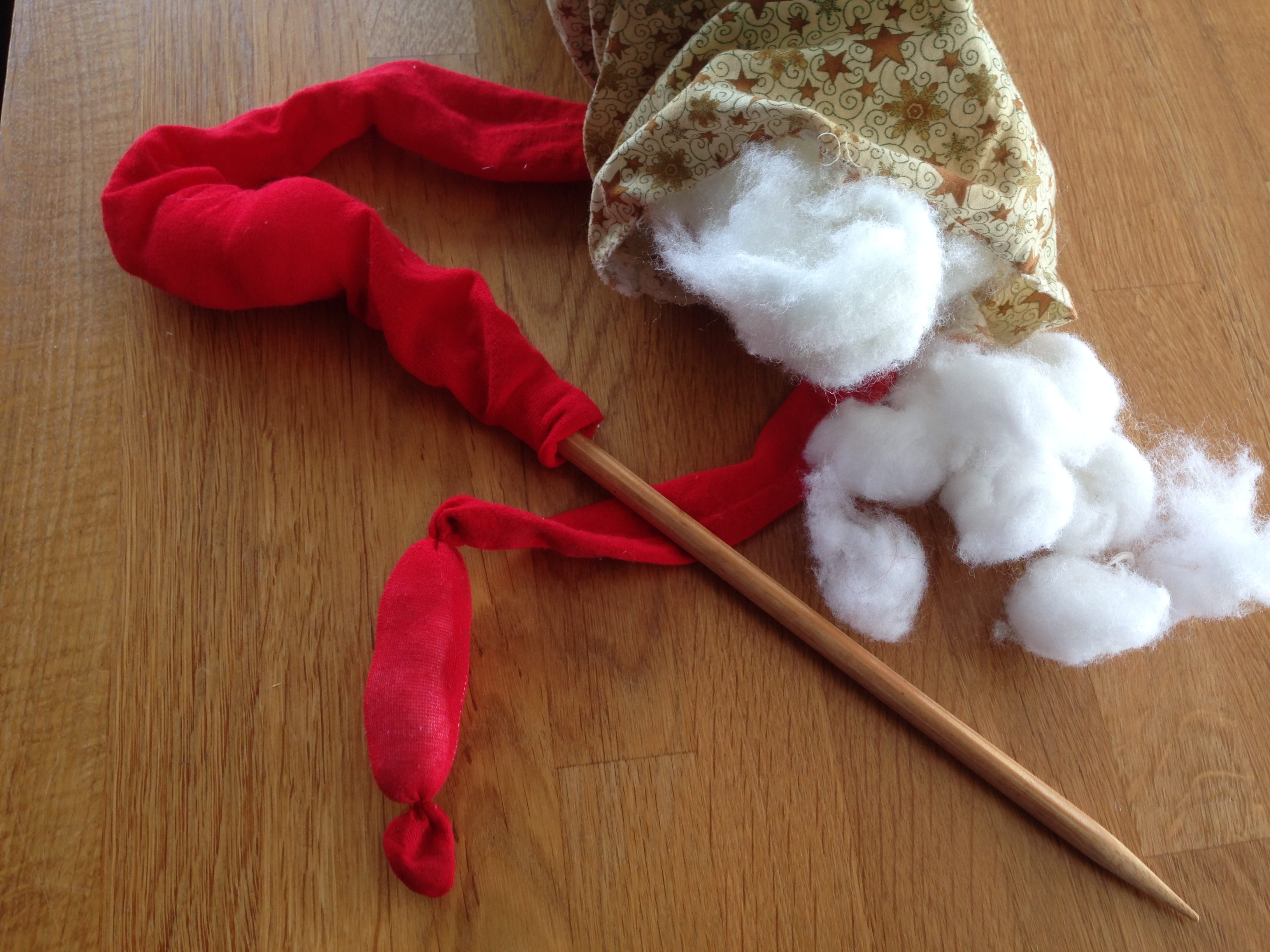 Først har jeg syet en løbegang i hvert strømpebukseben. Syningen blev ikke helt god, da jeg var i tvivl om, hvordan symaskinen skulle indstilles og der skulle nok også være brugt en jerseynål – men det gik alligevel. Så er strømpen fyldt med pladevat fra en gammel pude. Jeg brugte en strikkepind til at få fyldet skubbet helt ind.