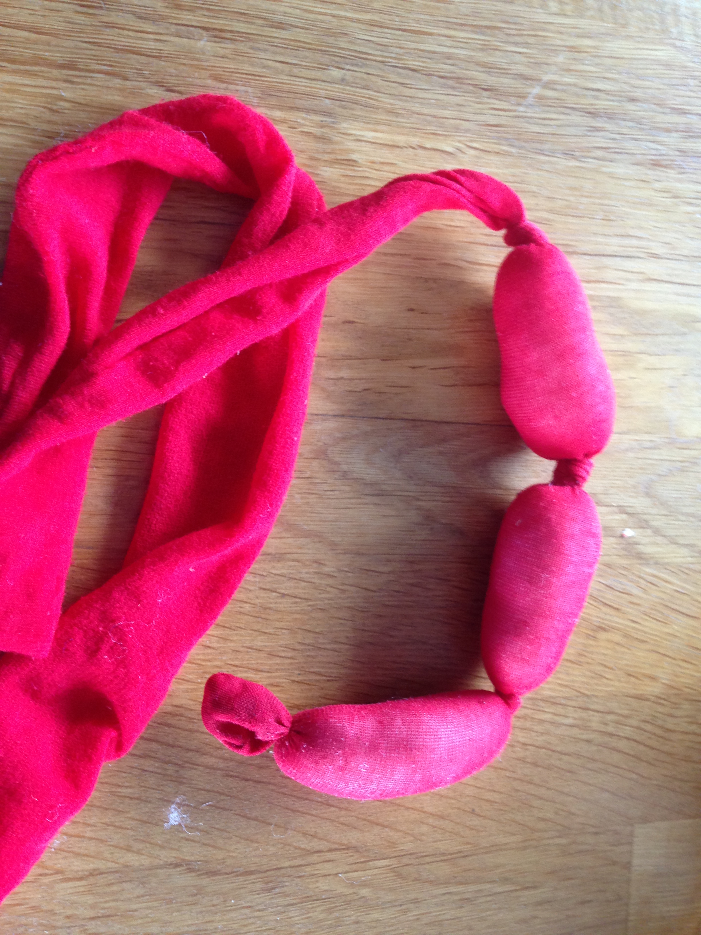 Min datter fylder 6 år og denne fødselsdag har jeg været ekstra kreativ med gaverne, og har fået syet forskelligt legemad til hendes købmandsbutik. Det første du skal se er, hvordan jeg har omdannet et par røde nylonstrømper til en pølserække.
