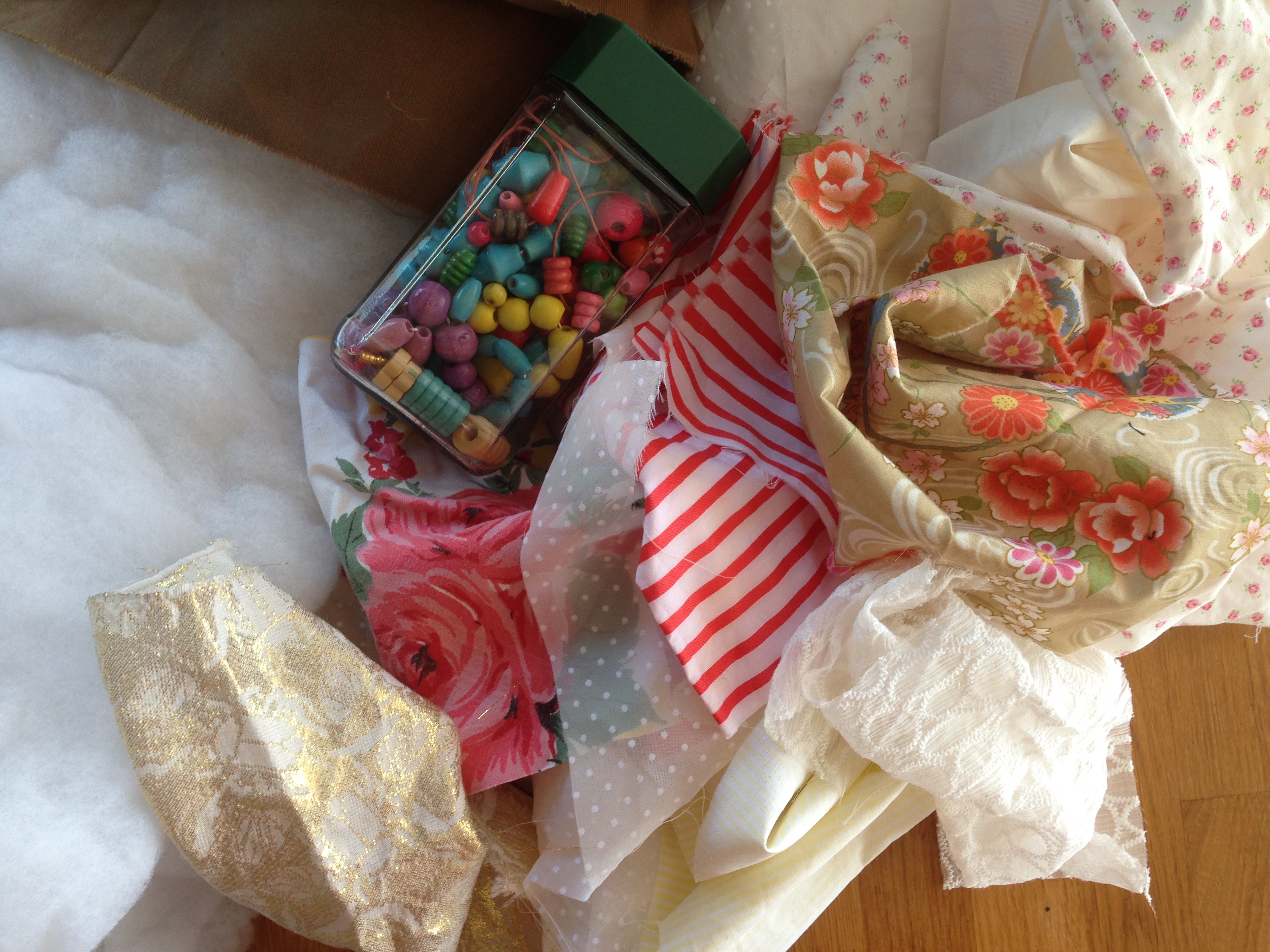 Sådan ser det ud før og færdigt – lavet af stofrester og med forskellige perler, der skal forestille frugter og pynt.