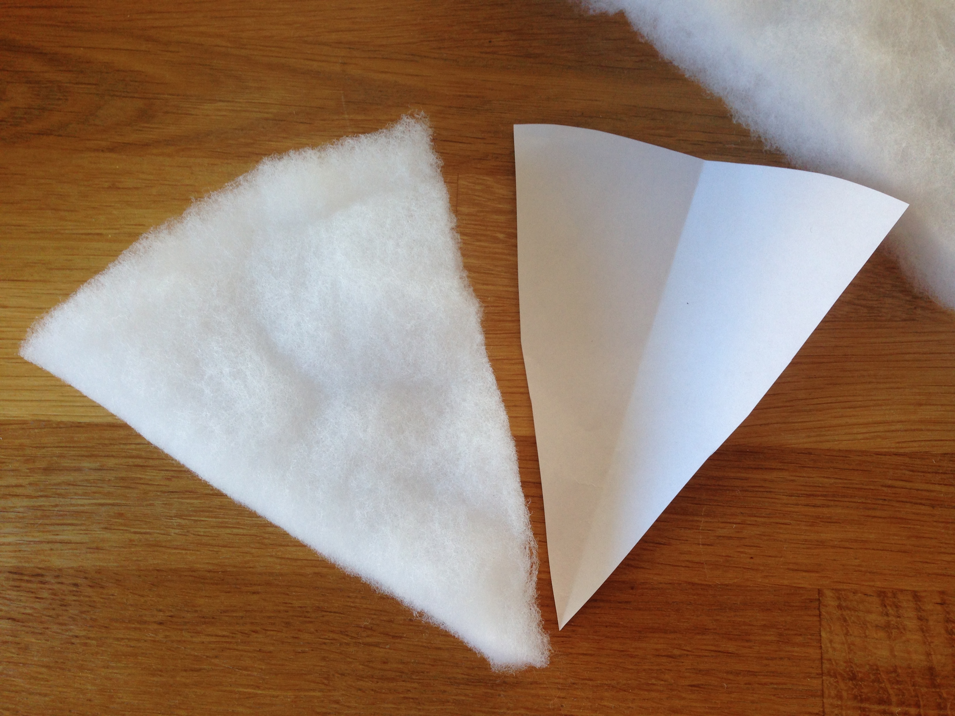 Kagestykket er bygget af tre kagebunde, to frugtlag og kagecreme mellem lagene. Først klippede jeg de fem lag i pladevat taget fra en gammel frakke. Jeg brugte en skabelon i papir.