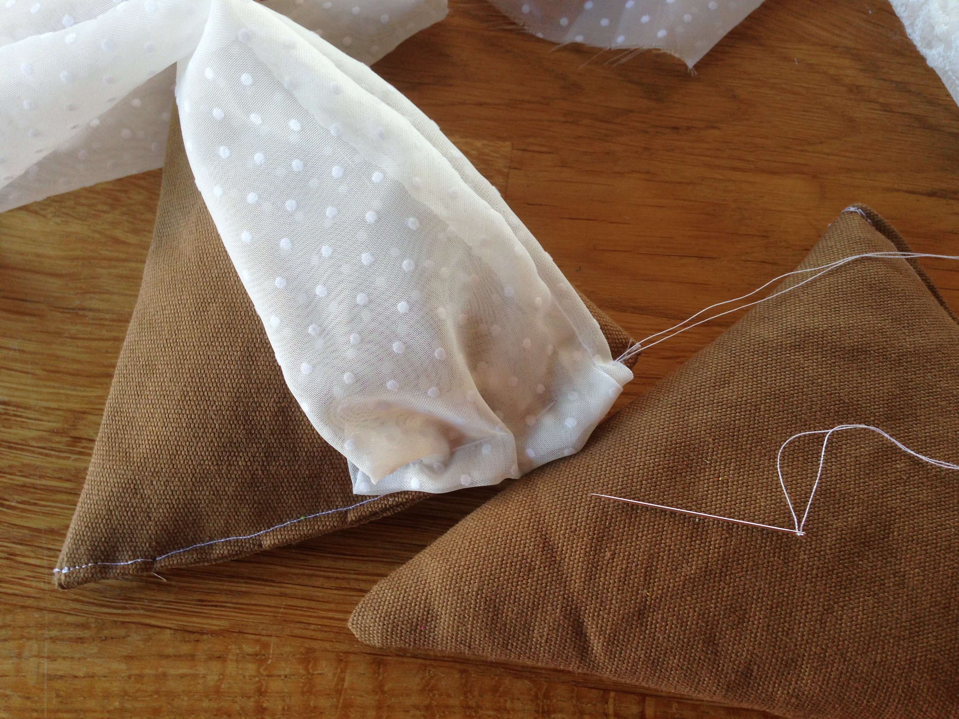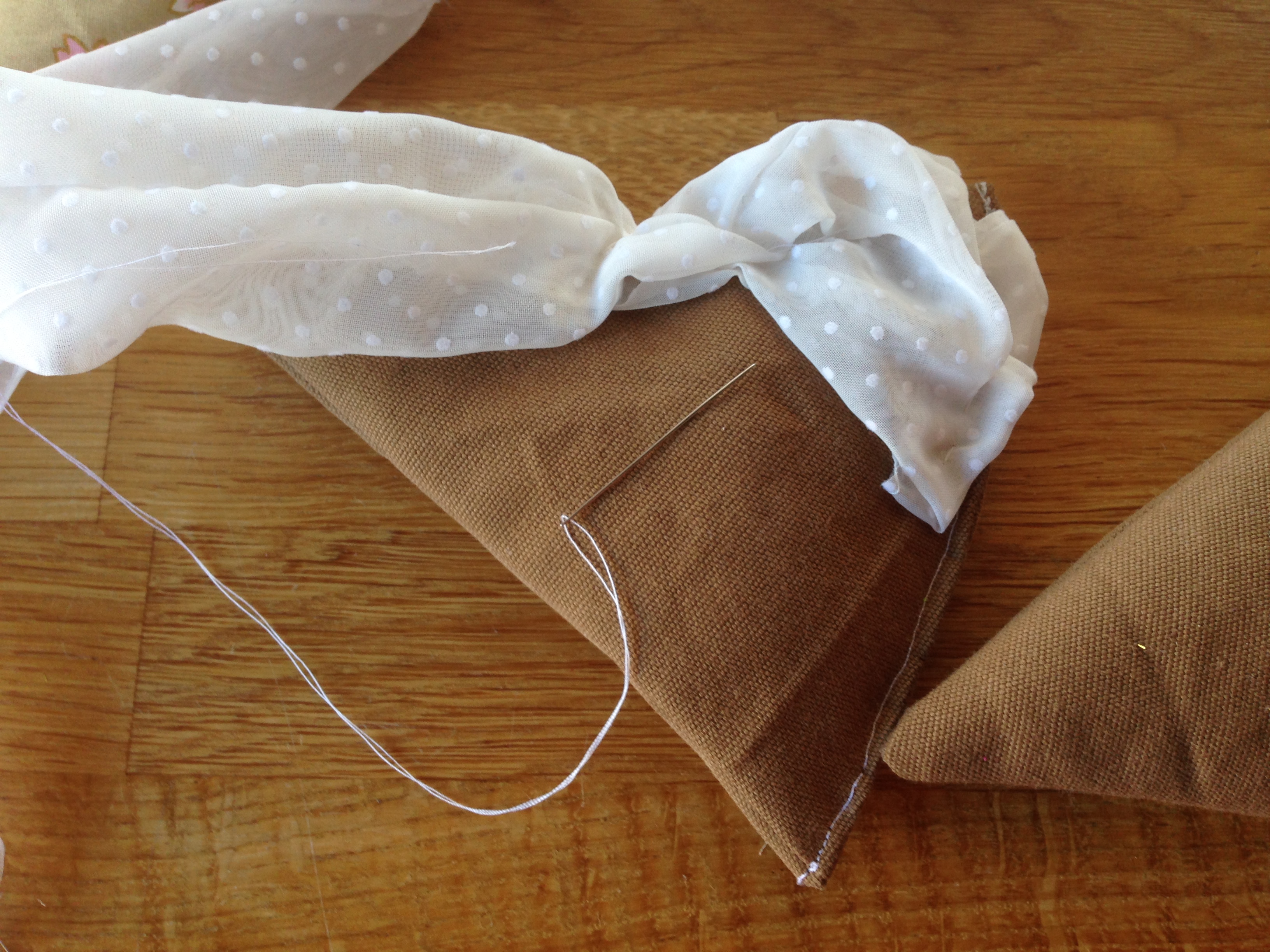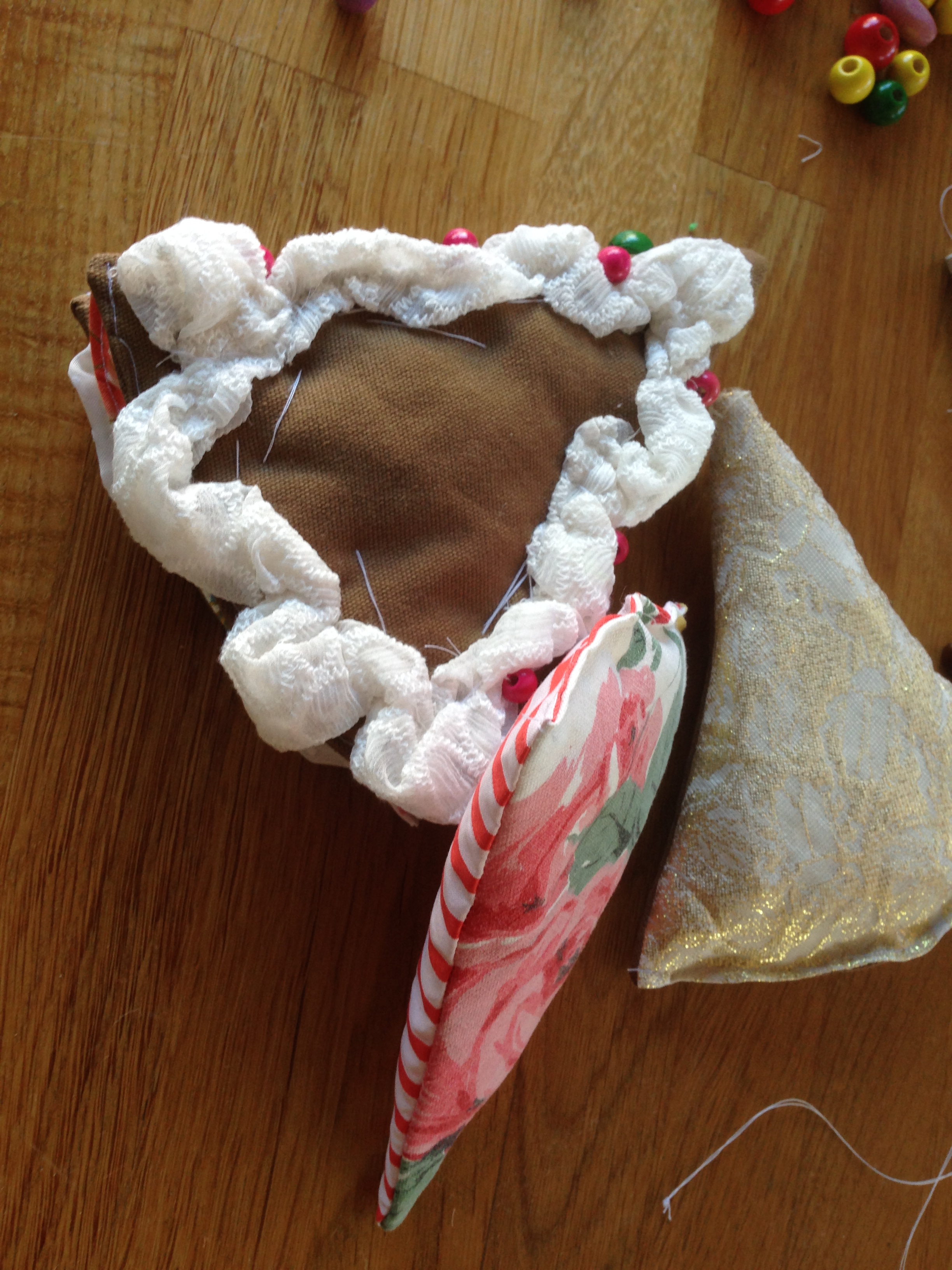 Lagene er betrukket med brunt stof til bundene (øverste bund har stof med guldtryk på den ene side til kagens top) og blomstret stof til frugtlagene. Kagestykket er bygget op/syet sammen fra nederste lag og op. Cremen, der er stykker af blonde- eller tylagtigt stof, er syet på i hånden sådan her.
