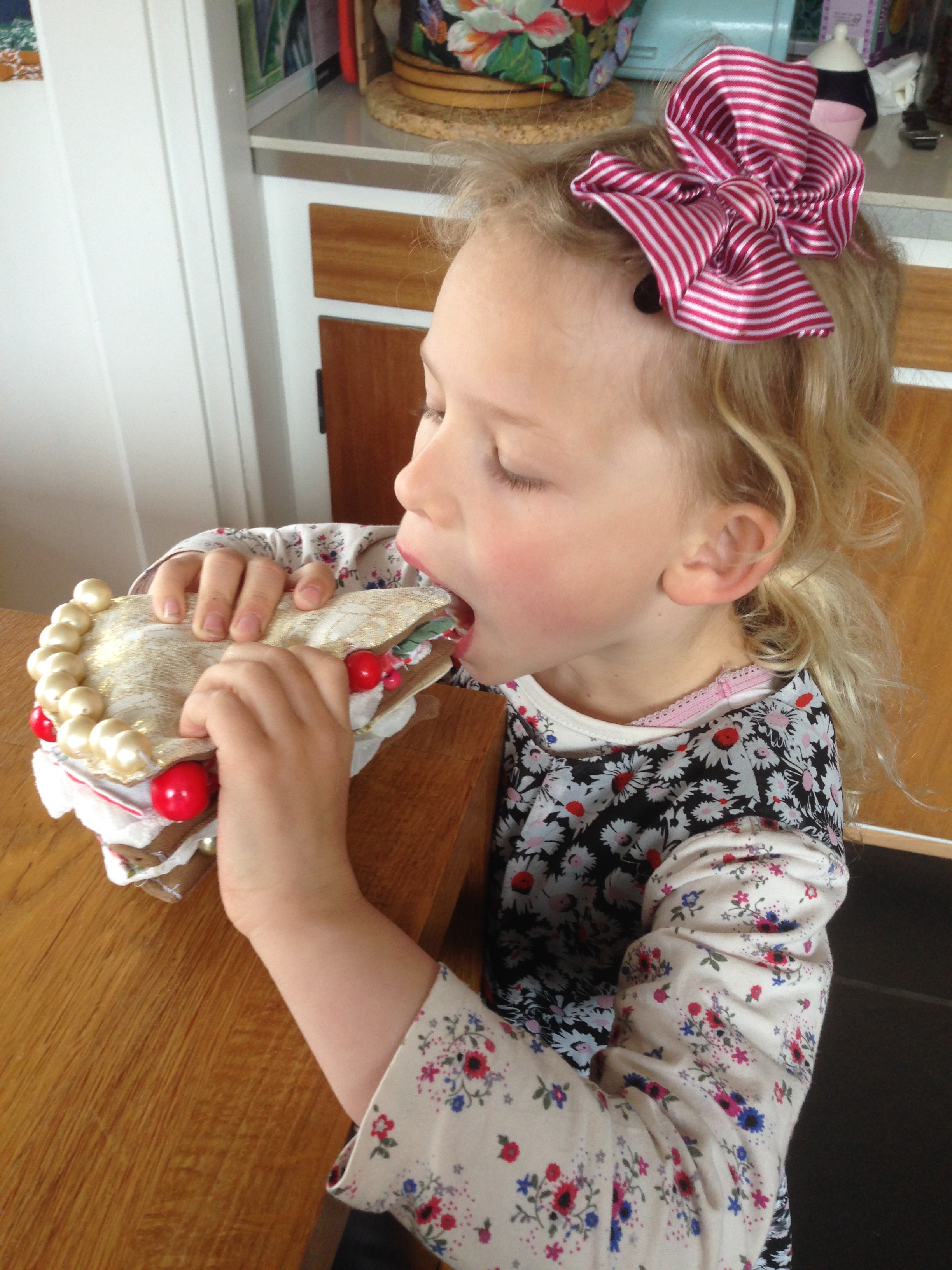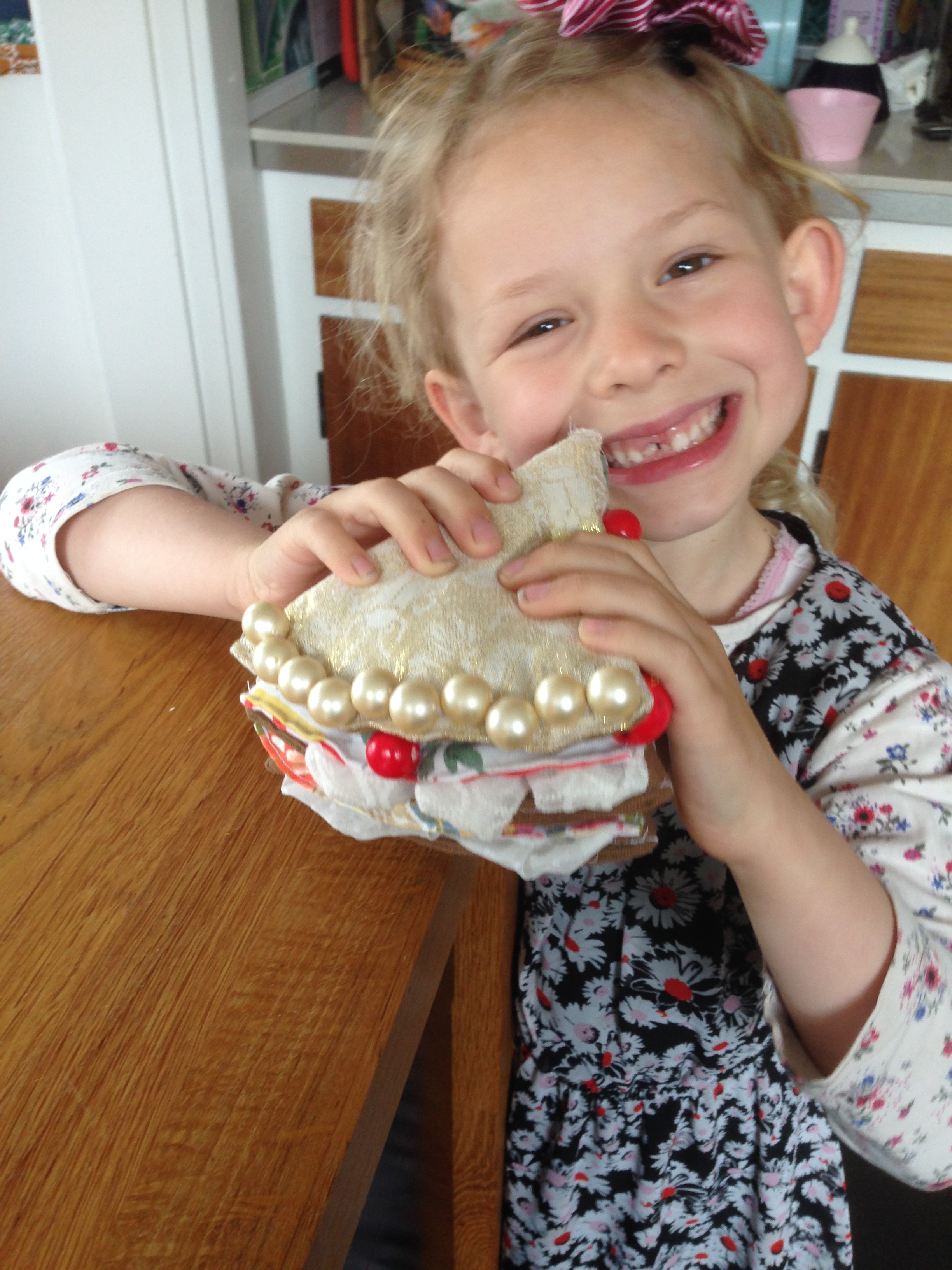 Har længe haft planer om at sy en legelagkage, og da jeg skulle bruge en gave til en polterarbend var anledningen der. Det lyder måske sært med en hjemmesyet lagkage til en polterarbend, men jeg skulle medbringe en gave til en gætteleg, hvor bruden, min tidligere overbo, skulle gætte hvem gaven var fra og evt. knytte en fælles historie til gaven. Da vi har boet på Christianshavn ved lagkagehuset, skulle kagestykket lede hende på sporet, og hun gættede også at gaven var fra mig 🙂 Håber, at hendes børn vil sætte pris på kagestykket – for det er da blevet ret deluxe, når jeg selv skal sige det.