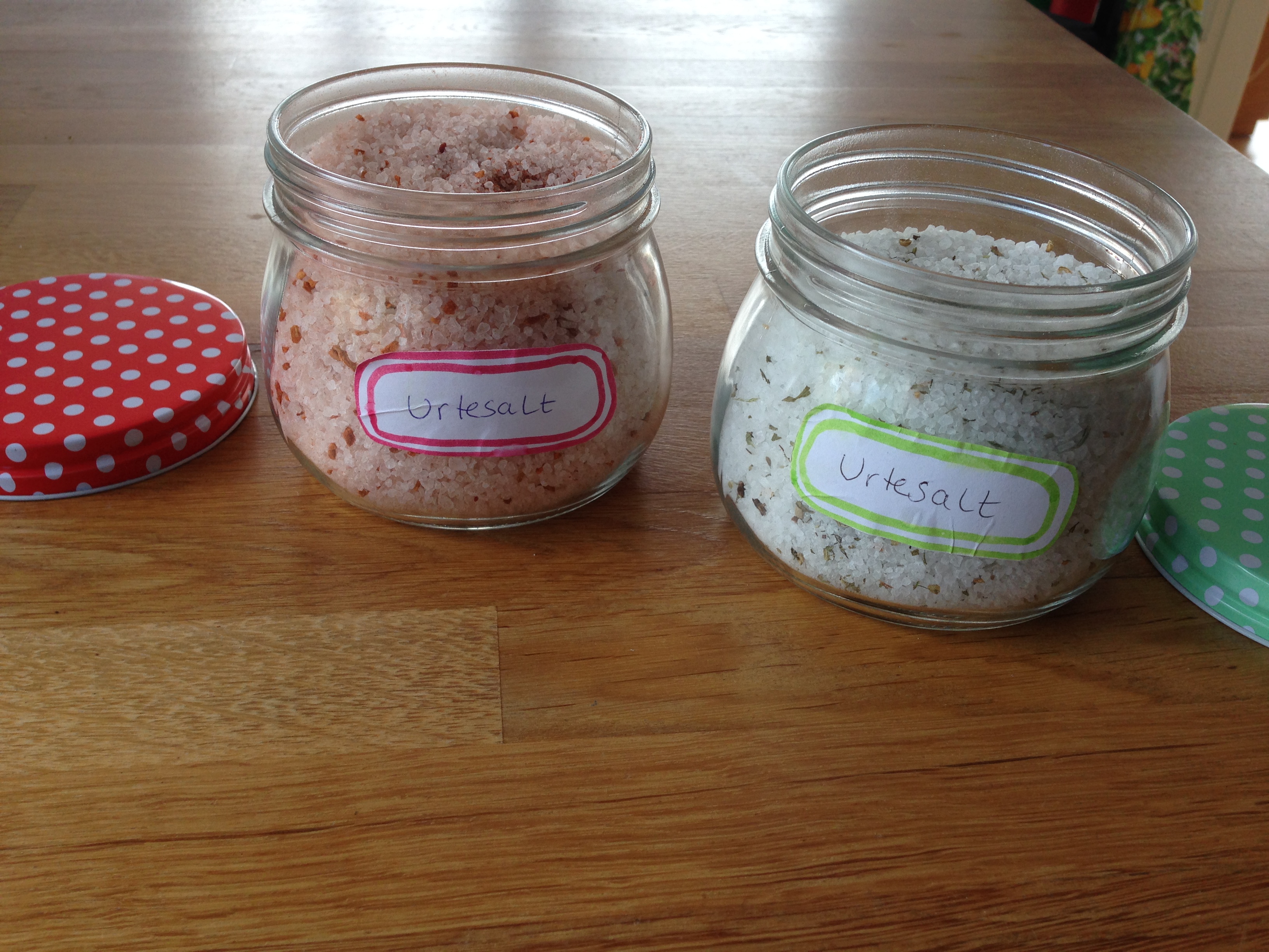 Den ene salt er med hvidløg og grønne urter og den anden med paprika og chili. Kryddersaltene var pakket i hvert sit genbrugte syltetøjsglas med låg, der matcher hver salt i rød og grøn.