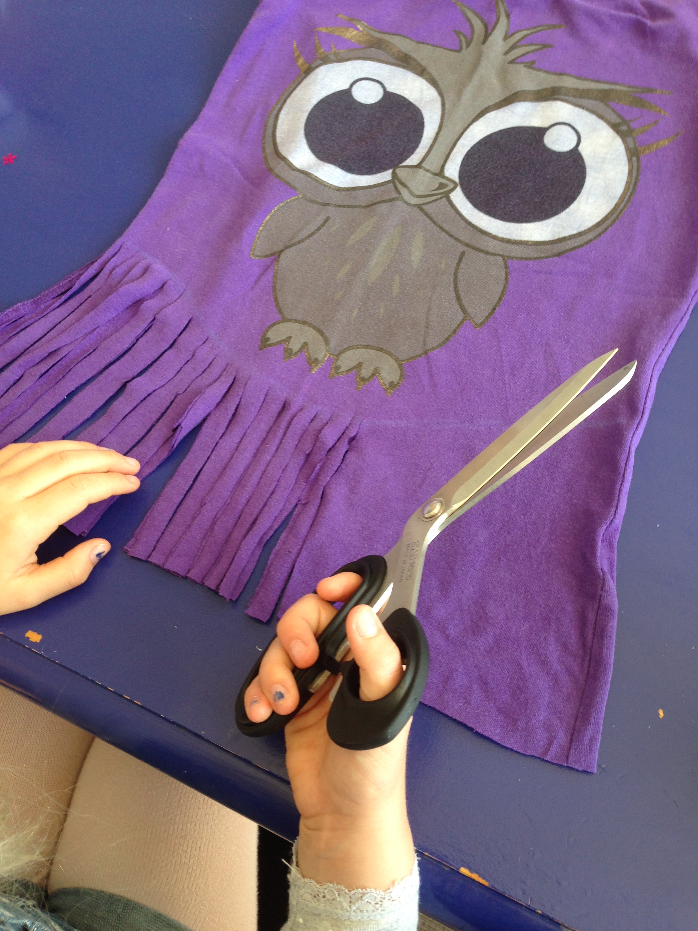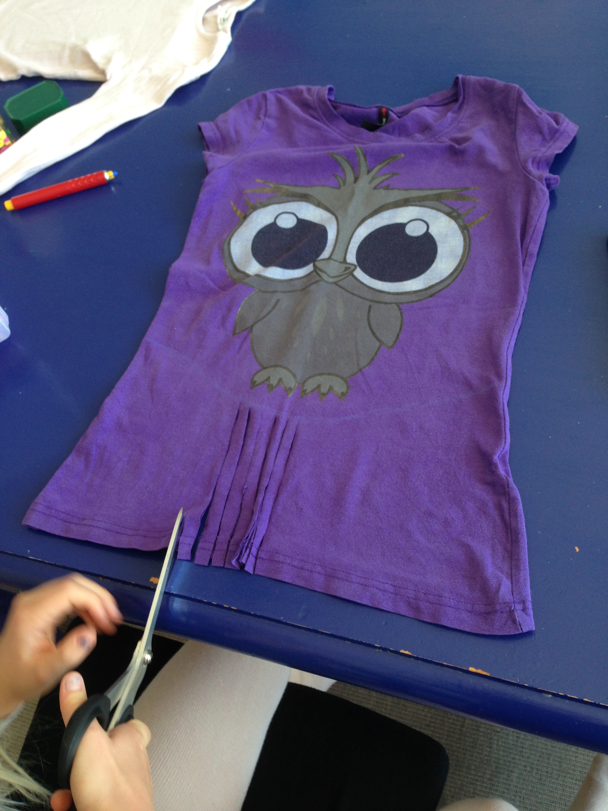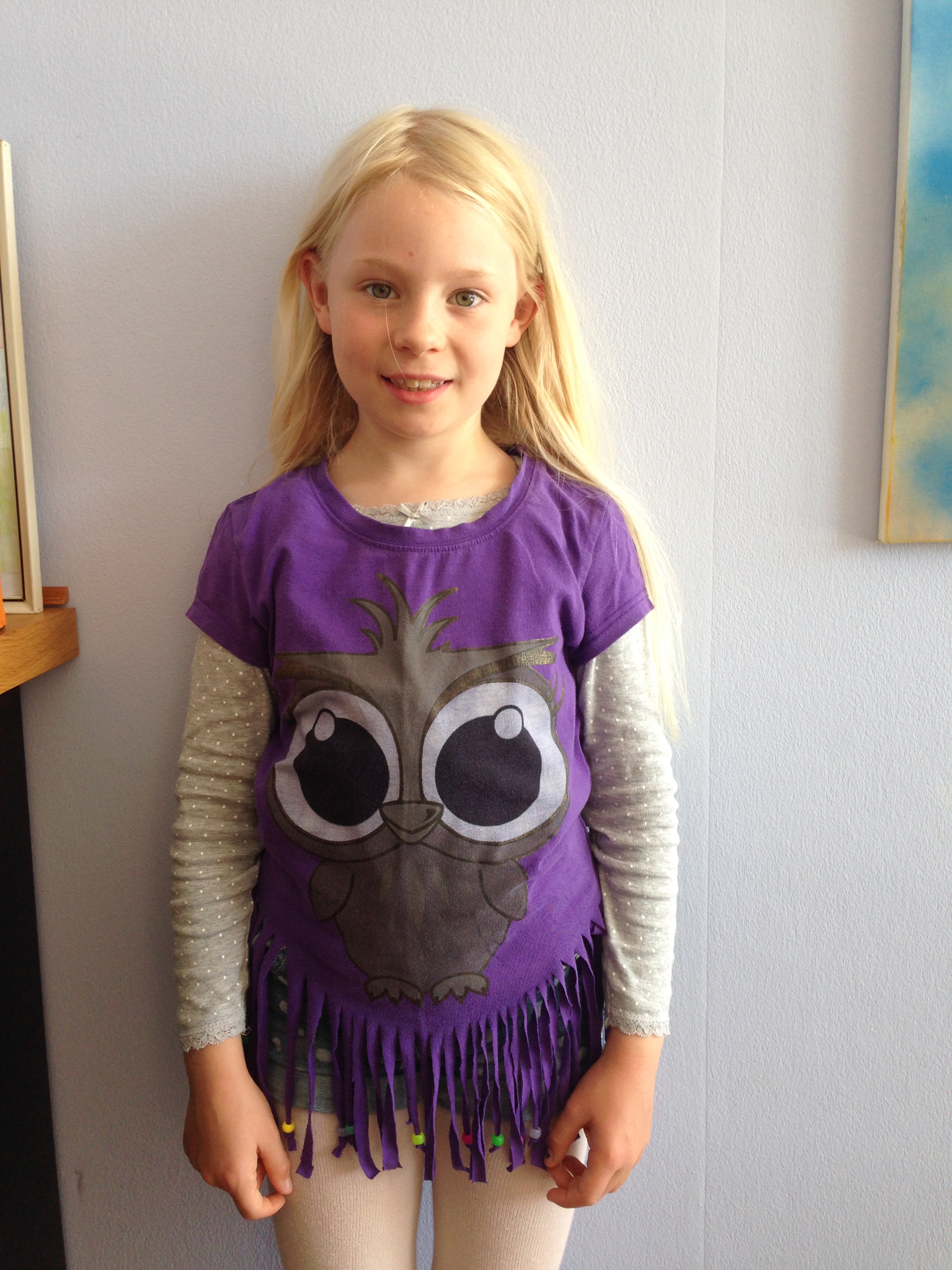 Min ældste datter fik denne T-shirt (købt på et loppemarked) til formålet. Uglemotivet er rigtig sødt og den passer hende, bortset fra at den var meget lang. Den var derfor perfekt til et ‘frynse-projekt’, der ellers kan gøre en T-shirt for kort, når der klippes frynser i kanten nederst.