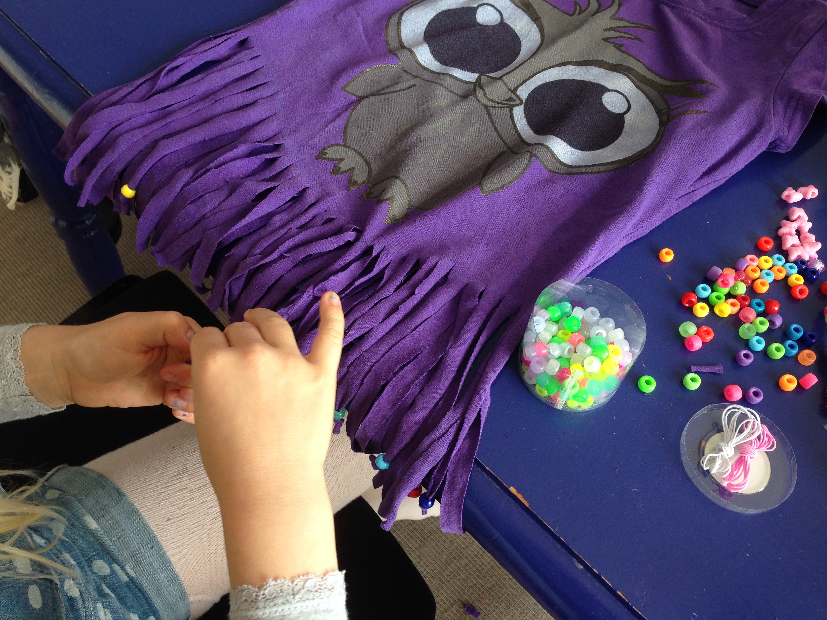Hun blev hurtig træt af at sætte perler på, og det er ikke alle frynser, der har en perle. Resultatet er alligevel godt og T-shirten bliver heller ikke for tung med en masse perler på. Men bedøm selv her.