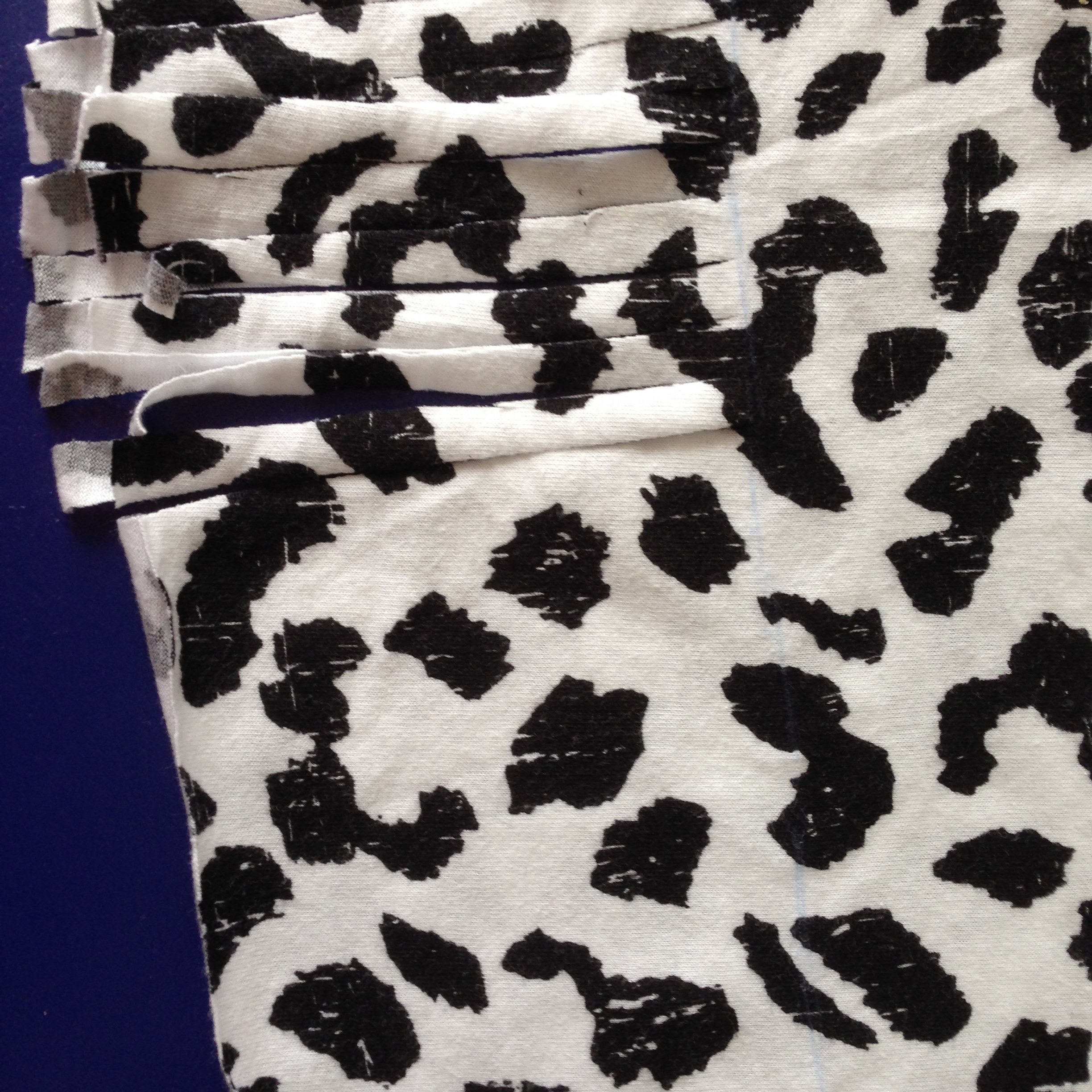 Vi satte en buet streg med kridt omkring motivet nederst på T-shirten, som hun klippede efter med en stofsaks. Frynserne blev på den måde længere i siderne end midt på T-shirten. Begge lag af T-shirten, altså både for- og bagside blev klippet på en gang.
