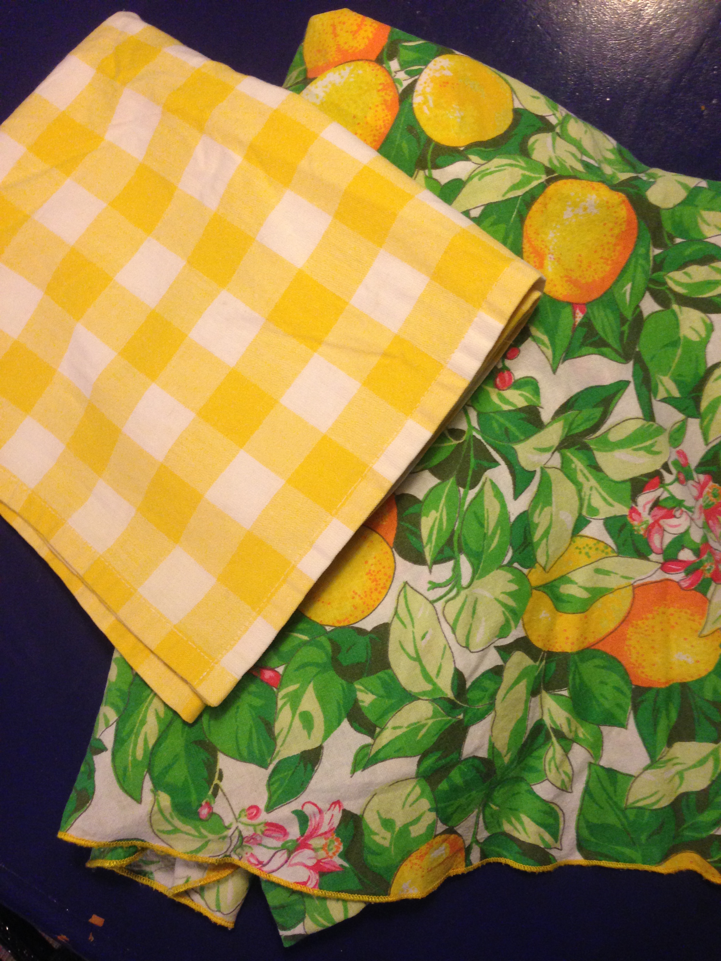 Der er så meget fedt stof i brugte duge, og som du måske tidligere har læst, elsker jeg at bruge dem som skørter i pigekjoler. Her er en mere af slagsen – med citroner på.