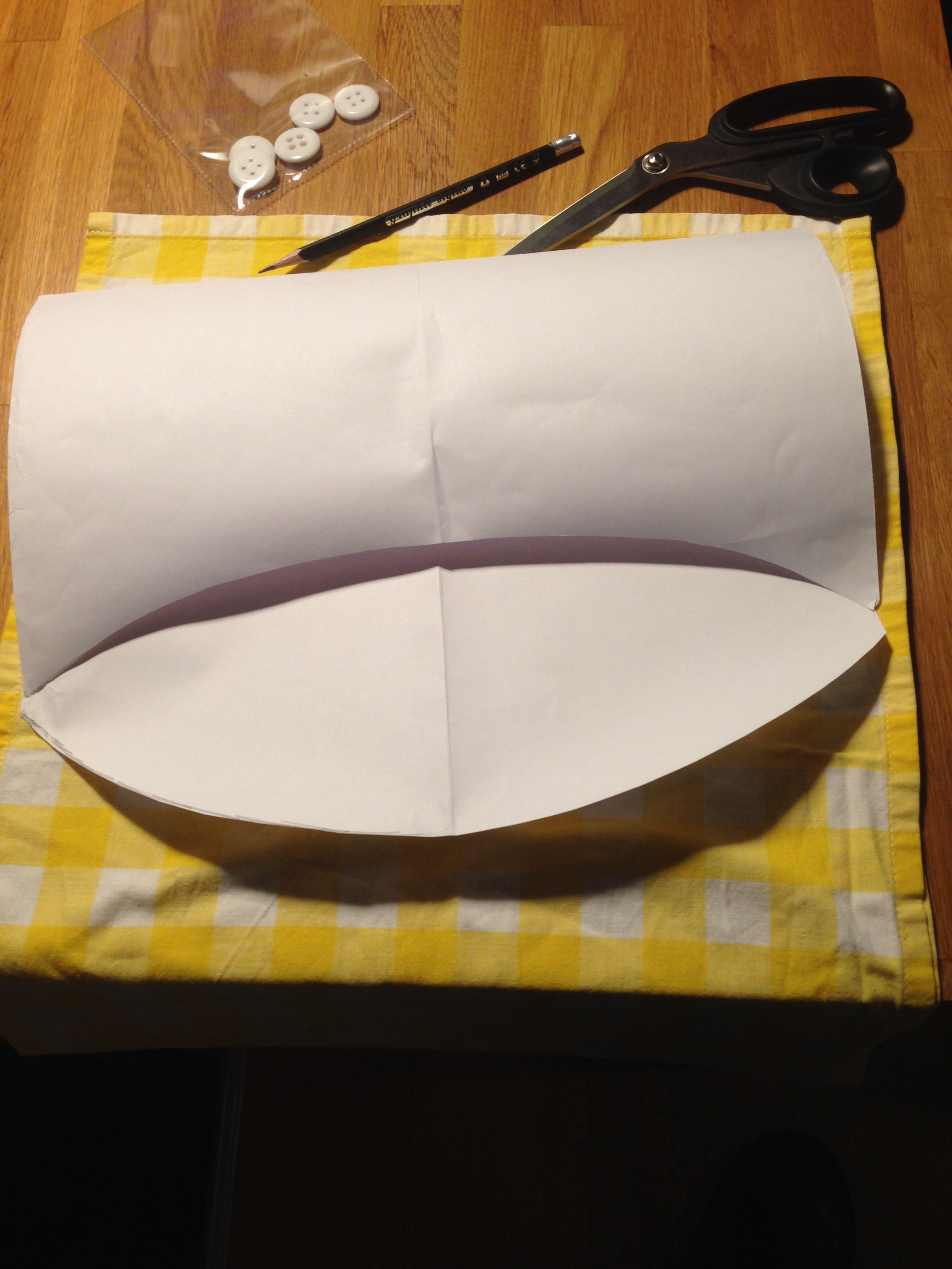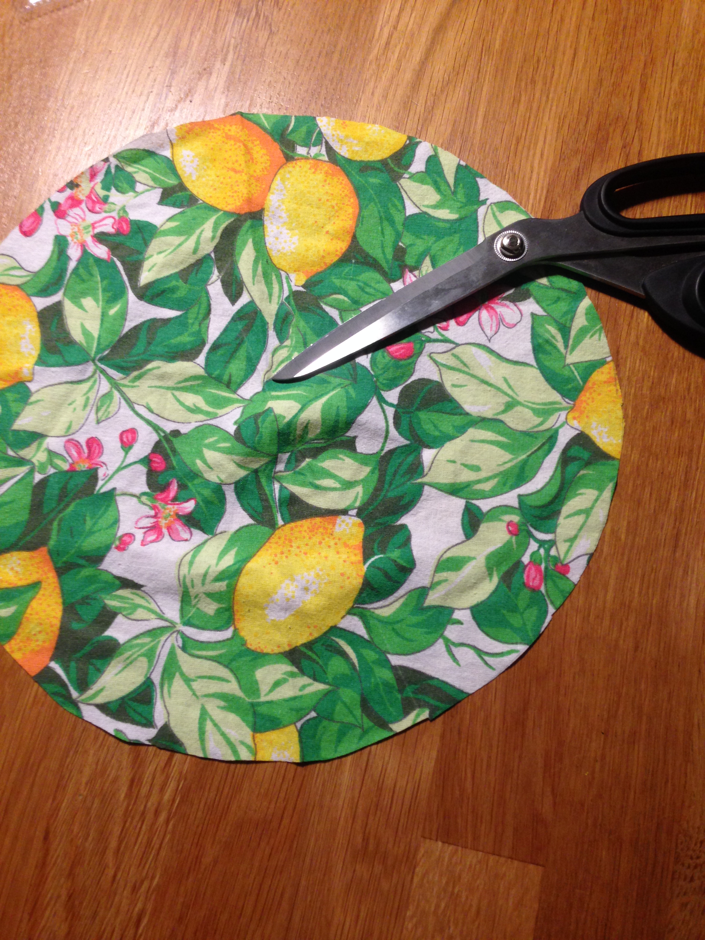 Først klippede jeg et rundt stykke af den midterste del af dugen ud. Jeg tog mål på min datter og brugte en tallerken til at måle stykket op med.