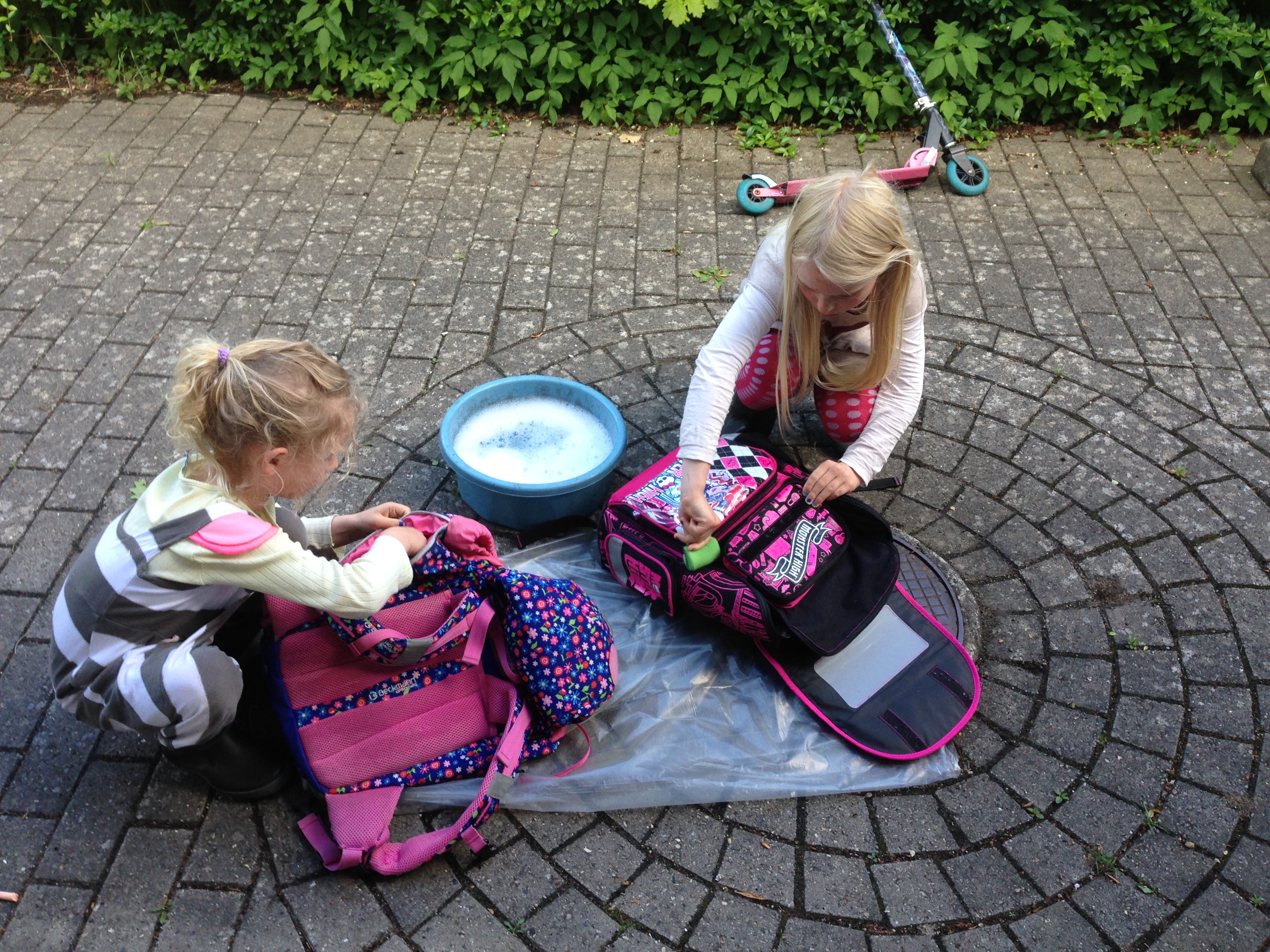 Tasken var ellers meget lidt slidt og fejlede intet. Desuden vidste jeg, at hun ville vælge en ny taske omtrent magen til, hvis vi tog på taskeshopping i storcentret, og at det derfor ville være ærgerligt at kassere den eksisterende taske til fordel for en ny. Det tog lidt tid at overtale hende. Og det var faktisk først, da jeg fik fremhævet de funktioner, såsom et smart neonfarvet regnslag, som manglede på storesøsters “nye” taske, at hun overgav sig. Det hjalp også, at de begge fik lov til at gøre taskerne klar til det nye skoleår med en grundig vask med vand og sæbe, for ikke at tale om vandplaskeri selvfølgelig.