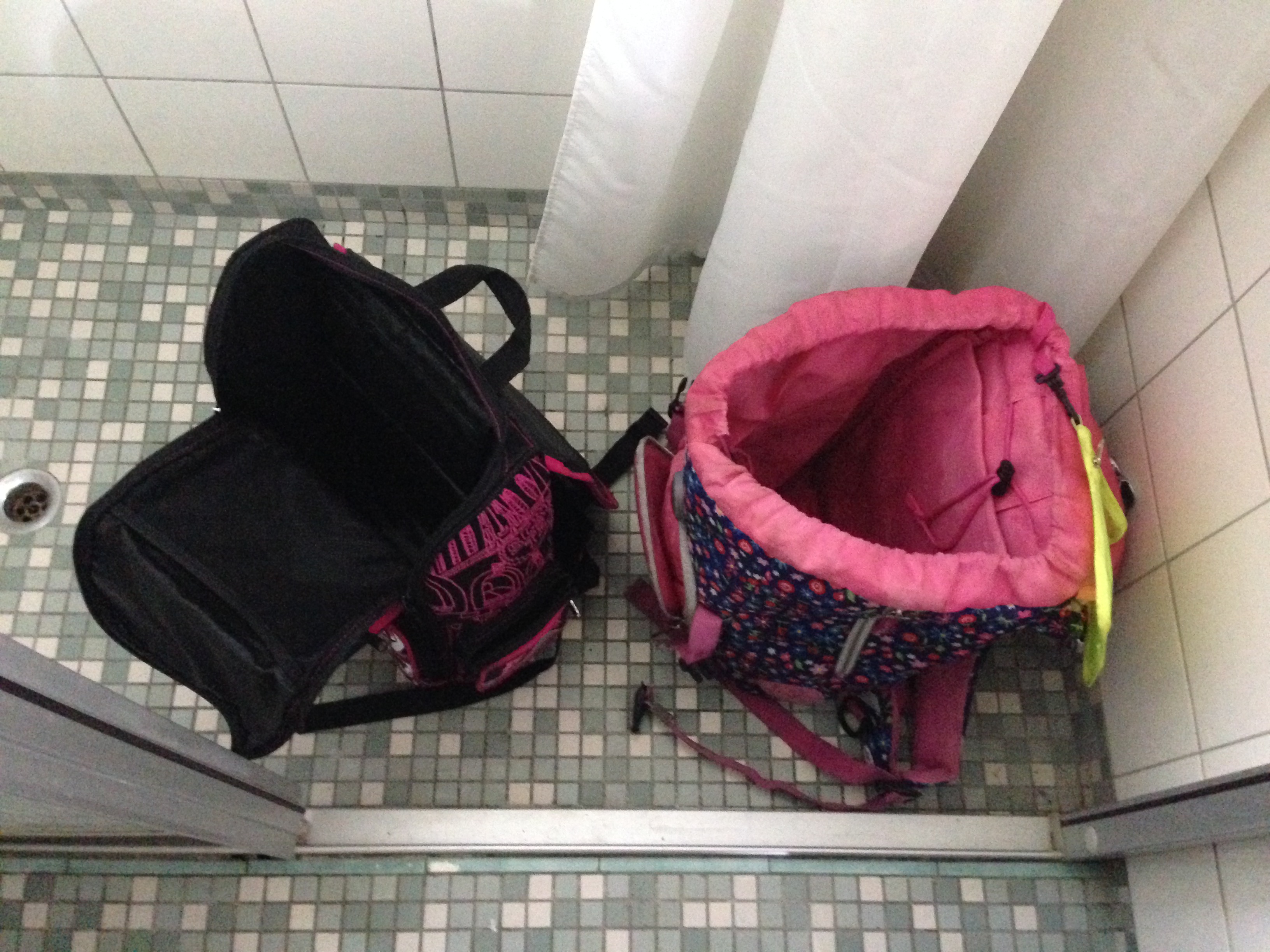 Lige et foto mere af de næsten skoleklar skoletasker. Her til tørre på badeværelsesgulvet.