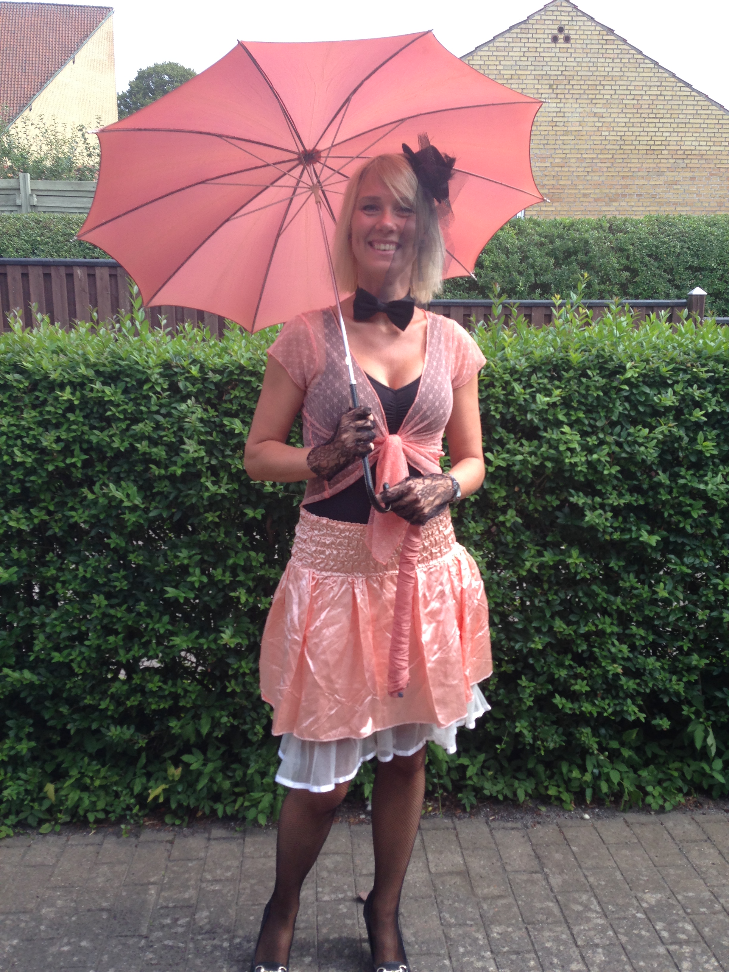 Her er så et kostume mere – ‘Linedanseren’ sammensat af diverse fra skabe og skuffer. Nederdelen er fra Brasilien, den fik jeg af min far, da jeg var 12 og gik til Lambada. Den fine paraply er købt brugt – kan også bruges i regnvejr. Det kan altid betalt sig at spørge mig, når man mangler udklædnings tøj 😉