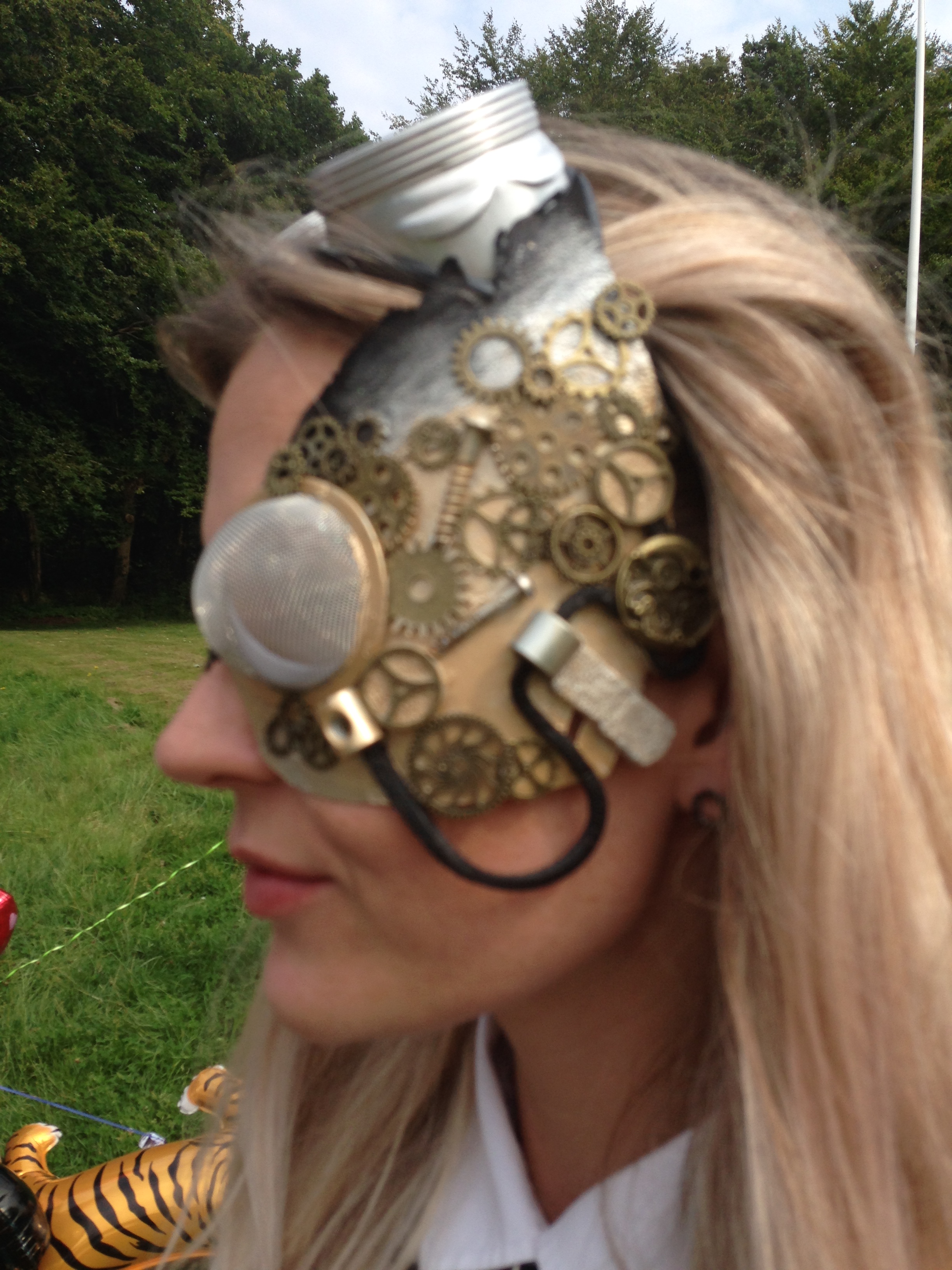 Til festen stødte jeg også på et par genbrugselementer i kostumerne. Her et par fantastiske masker i Steampunk Victorian stil lavet af blandt andet pap, læder og en si til te. Tandhjulene var købt nye, men man kunne måske have brugt indmaden fra et vækkeur eller lignende, hvis alle maskens dele skulle have været genbrug/redesign.