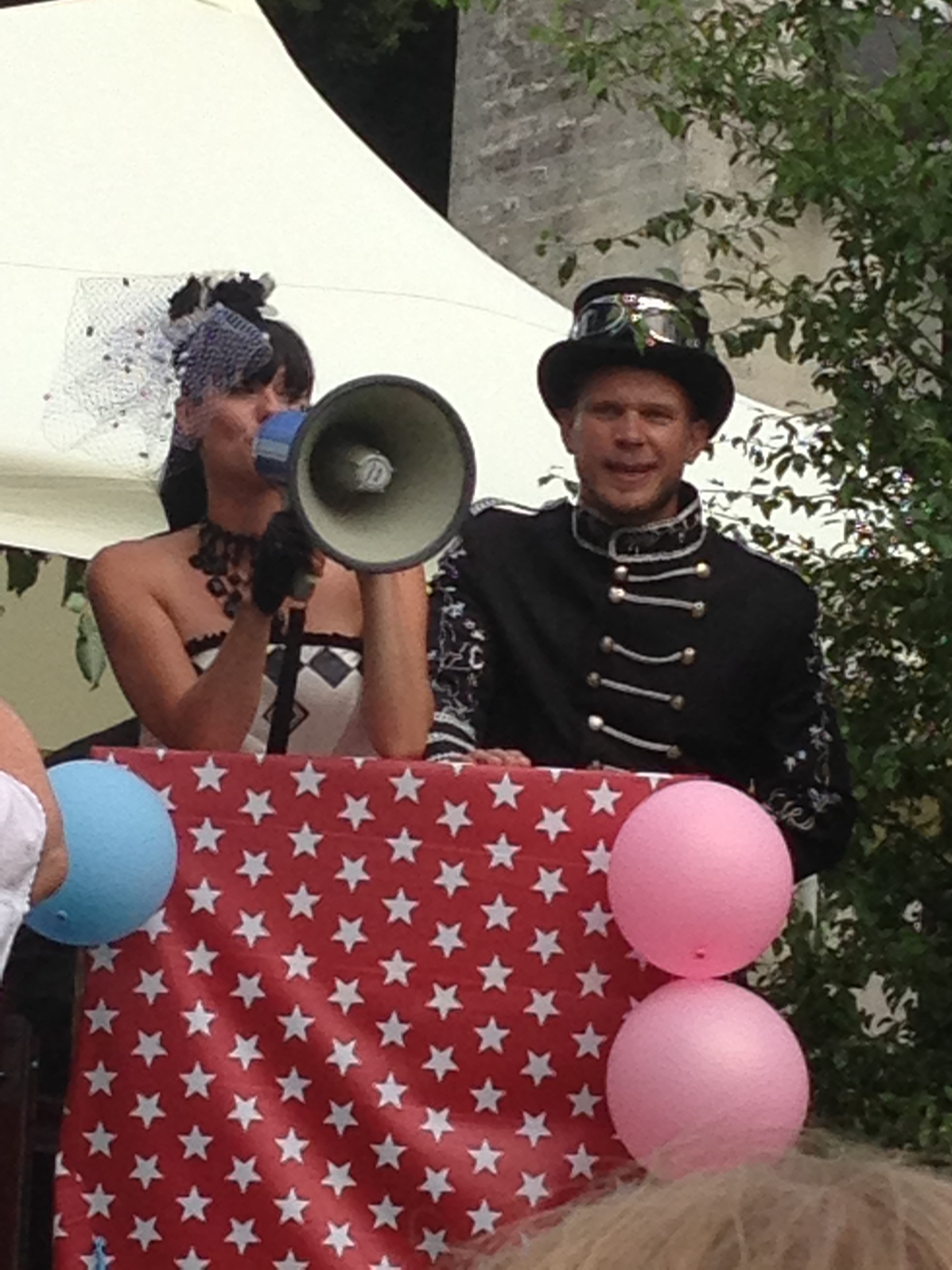 I skal også lige se et foto af brudeparret på talerstolen – alle taler foregik med megafon, hvilket var et meget underholdende og vellykket alternativ til det traditionelle setup.