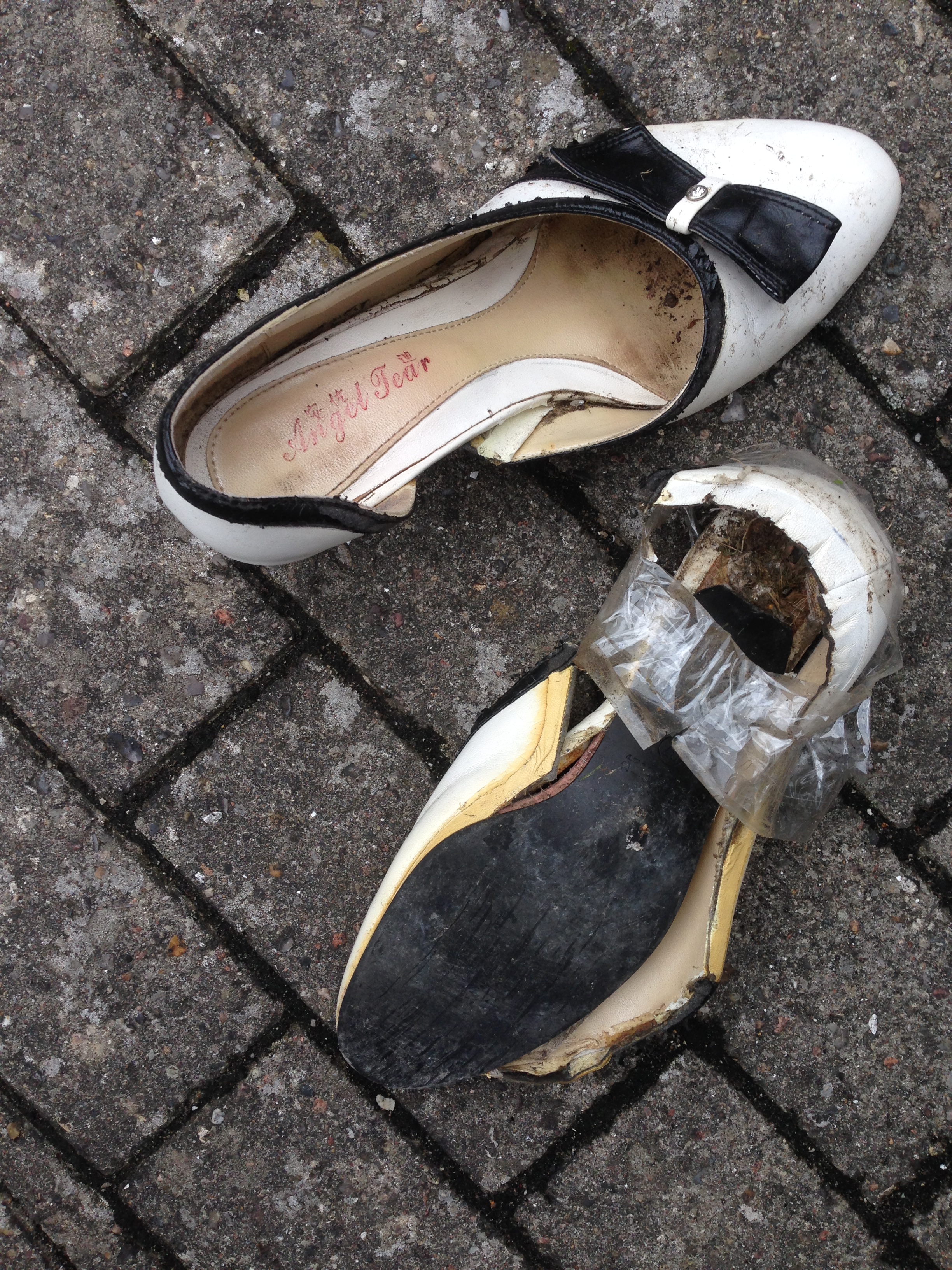 Derudover bød festen på skydetelt, gøgl og dans. Jeg fik danset en helt masse og her ser du så et eksempel på, hvordan brugte sko kan være lidt af et sats til en bryllupsfest 😉 – før og efter…