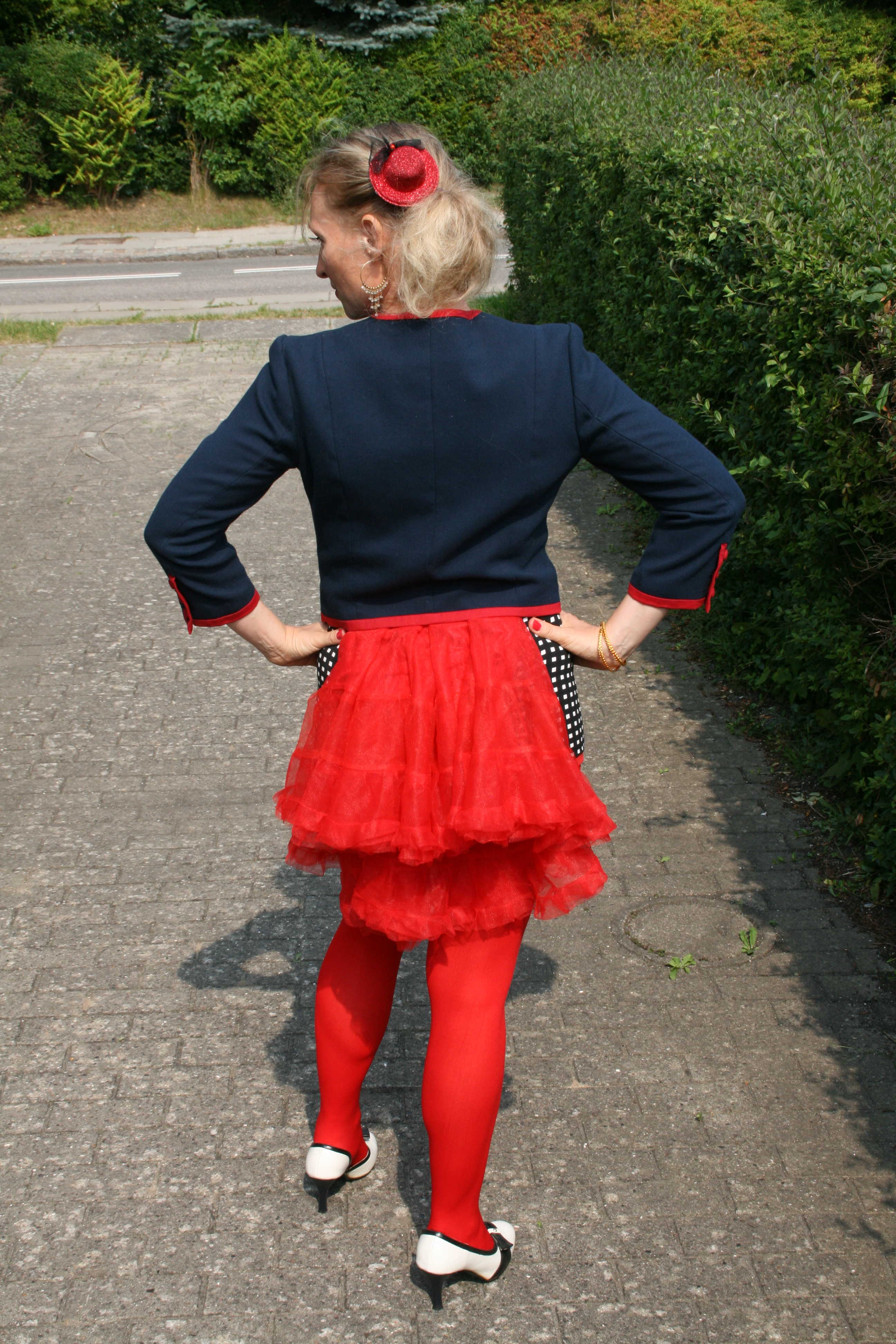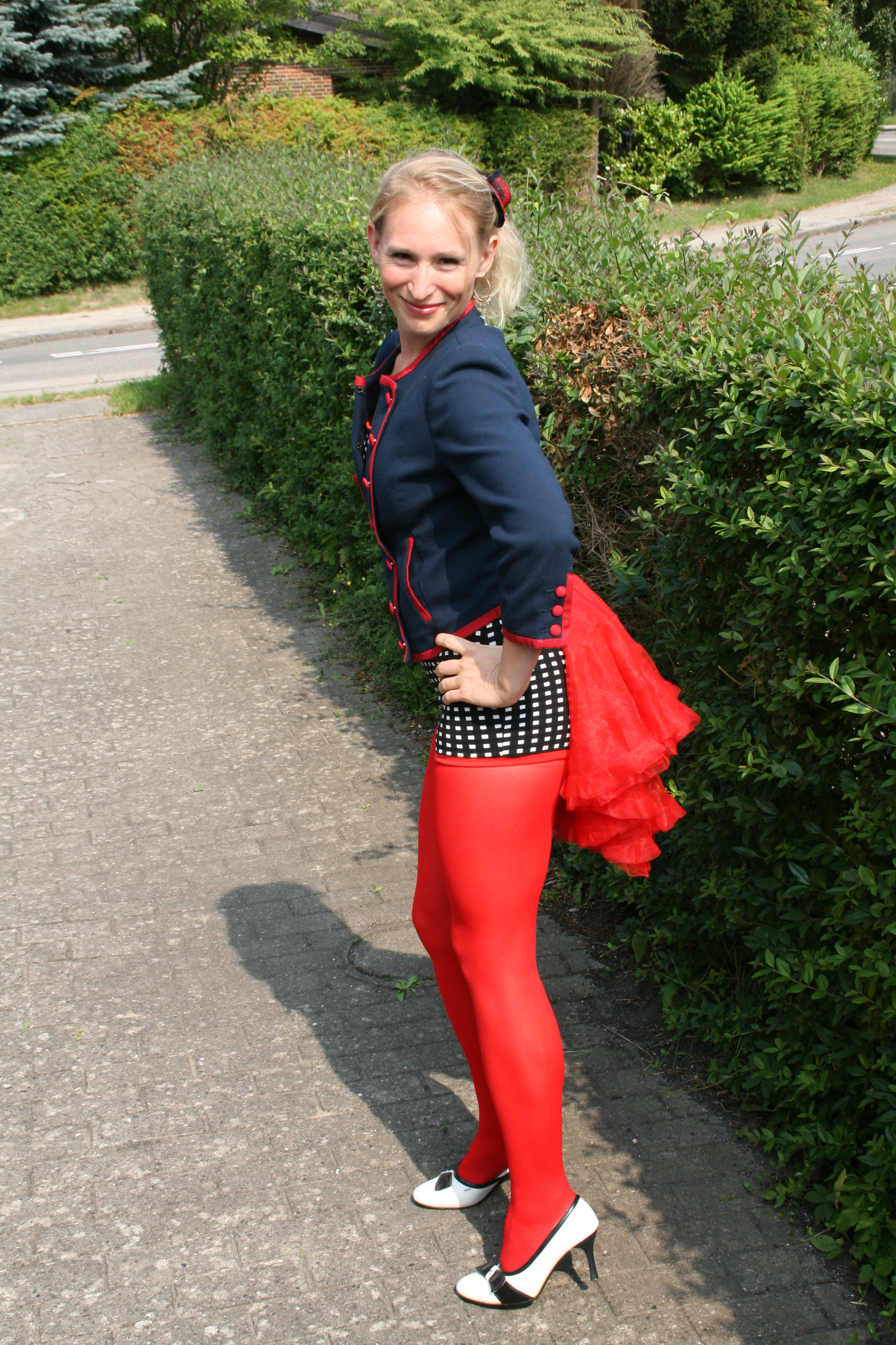 Jeg lånte min datters hårspænde med en lille rød hat på. Spændet er købt brugt i anledningen af hendes fødselsdag. Så blev det altså også til et par nye kunstige øjenvipper og røde strømpebukser fra Fest og farver – for de røde strømpebukser (som jeg troede jeg aldrig ville få brug for) havde jeg lavet pølserække til købmandsbutikken af her: Pølserække af nylonstrømpe