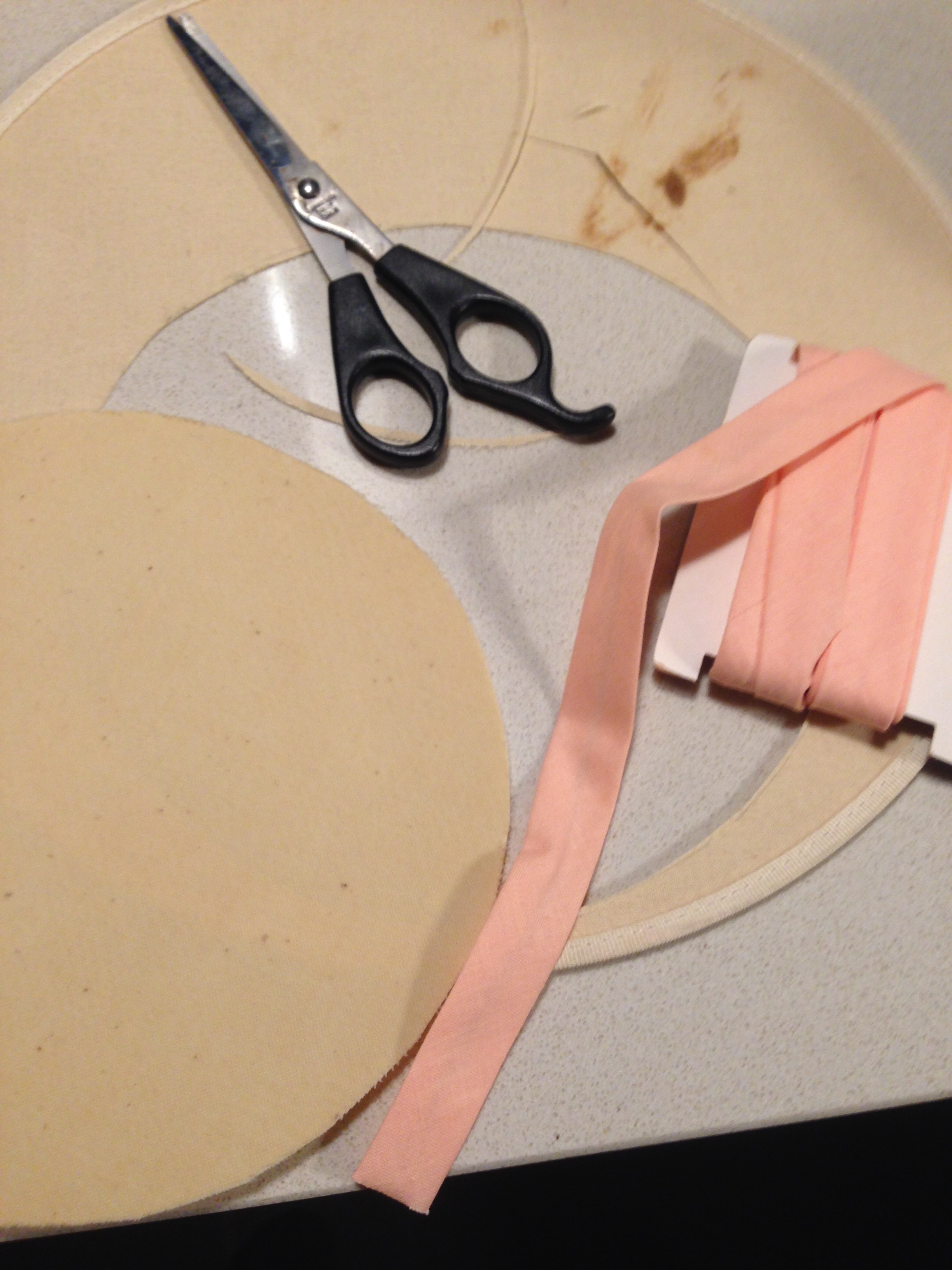 Den mindste lampeskærm er betrukket med en pink nylonstrømperest. Faktisk er det bare strømpefoden, der er trukket ud over og syet fast ved skærmens kant nederst. Skærmen havde et par pletter, hvilket strømpen også dækkede.