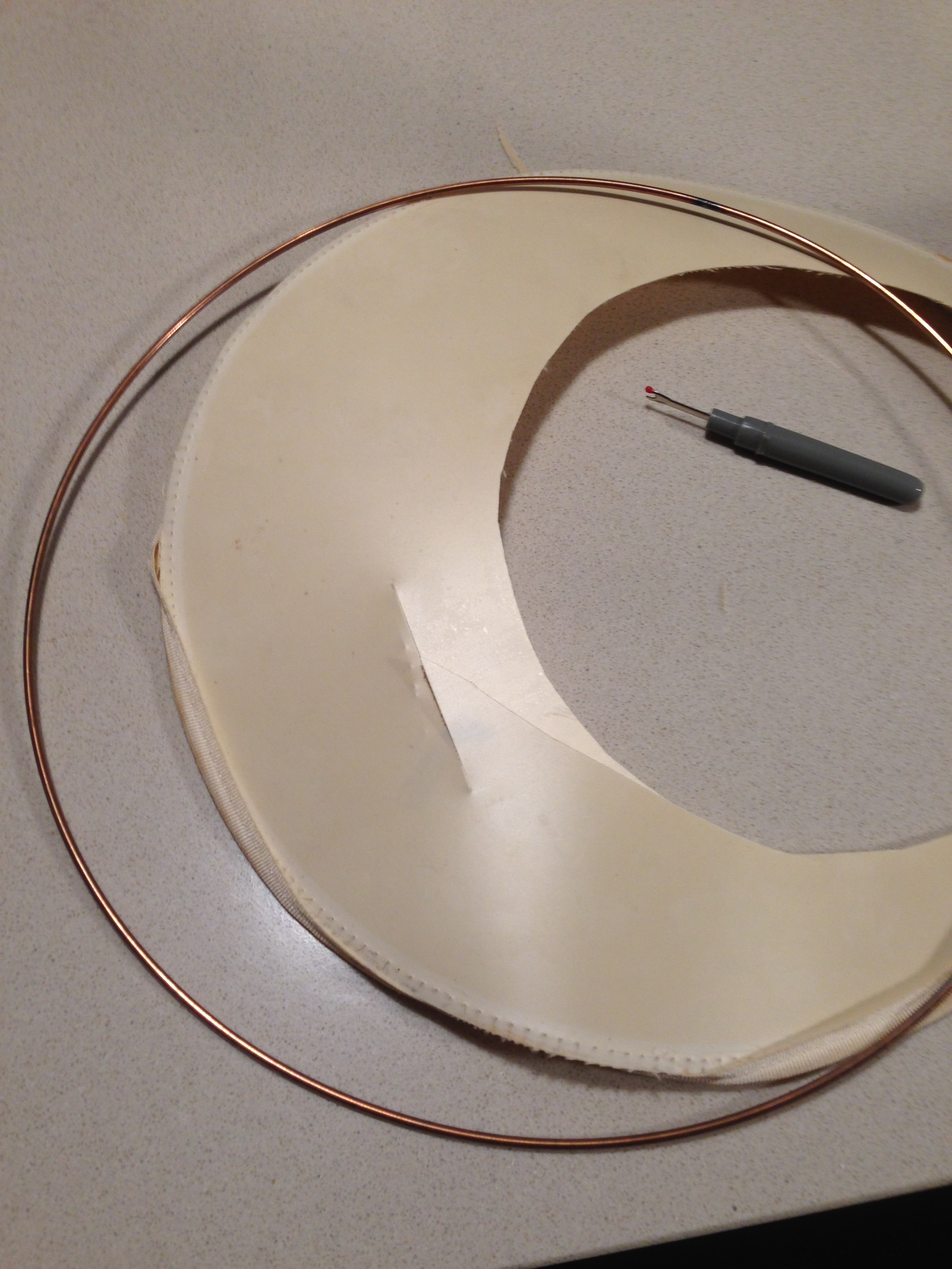 Skærmen manglede den top, der giver dæmpet belysning. Jeg havde en skærmtop (eller hvad de hedder) fra en større lampe, der havde en brændplet. Pletten klippede jeg uden om og fik lavet en mindre top. I skærmens kant var for resten en fin kobberring, som nok kan indgå i et andet projekt, måske en drømmefanger – eller noget.