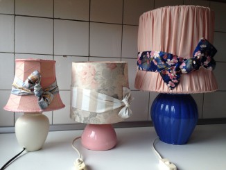 Alle tre lamper er fra 80’erne (vil jeg skyde dem til), og det var ikke nødvendigt at skifte ledningerne. Skærmen har fået nyt betræk og sløjfebånd.