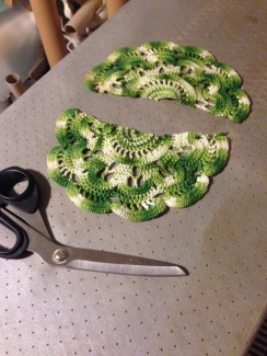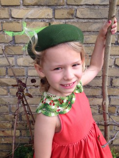 Derudover havde jeg en lille (fransk) hat i grøn med grønt tyl bundet på , som græskartop og en hæklet bordskåner til kjolekrave.