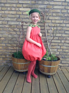 Min yngste datter gik med på min idé om at lave et græskarkostume, som jeg er ret stolt af. Det er syet af kraftigt orange stof (også købt brugt) – og der var lige præcis stof nok. Jeg brugte en af hendes kjoler som model.