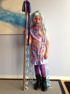 Min ældste datters kostume har du måske læst lidt om i indlægget her, hvor vi lavede lænker til et Monster High kostume. Kjolen er syet af et regnbuefarvet tørklæde og et dynebetræk i kunstig silke. Lænkerne er sat fast i et bælte.