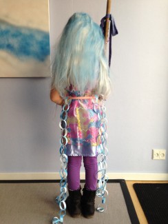 Parykken er købt brugt og var hvid til at starte med, så jeg gav den (som lænkerne) et sprøjt med den blå spraymaling. Det er ikke anbefalelsesværdigt, da parykken bliver klistret og svær at rede ud. Vi klippede også pandehår, hvilket heller ikke blev helt autentisk, men min datter var ok tilfreds – for blåt skulle håret død og pine være!