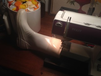 Ærmerne blev klippet af og syet til to rør, der blev syet fast i støvlen. Det var altså lidt sjovt at sy i en plastikstøvle, men nemt nok med en jeanssynål.