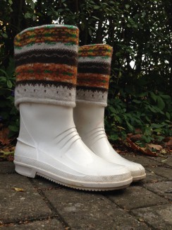 På en weekendtur til Berlin, for nogle uger siden, fik jeg inspiration til et par nye efterårsprojekter. I butiksvinduerne solgte de blandt andet strikkede pandebånd i den helt store stil, og jeg så også et par fine gummistøvler med strikkant. Og der er da ingen grund til at købe nyt, når man selv kan – og i forvejen har alle materialerne. Det vil sige både gummistøvler og min søsters aflagte striktrøje, der bare ventede på et nyt formål.