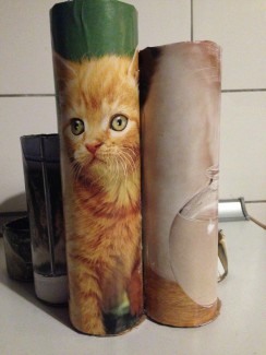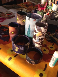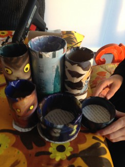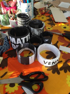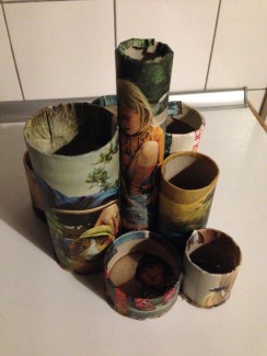 Derefter blev rørene beklædt med sider fra billedbøger og resterne af det musikmagasin, som vi brugte til den første kreastation. Vi brugte bare almindelige limstifter til at lime papiret fast med.