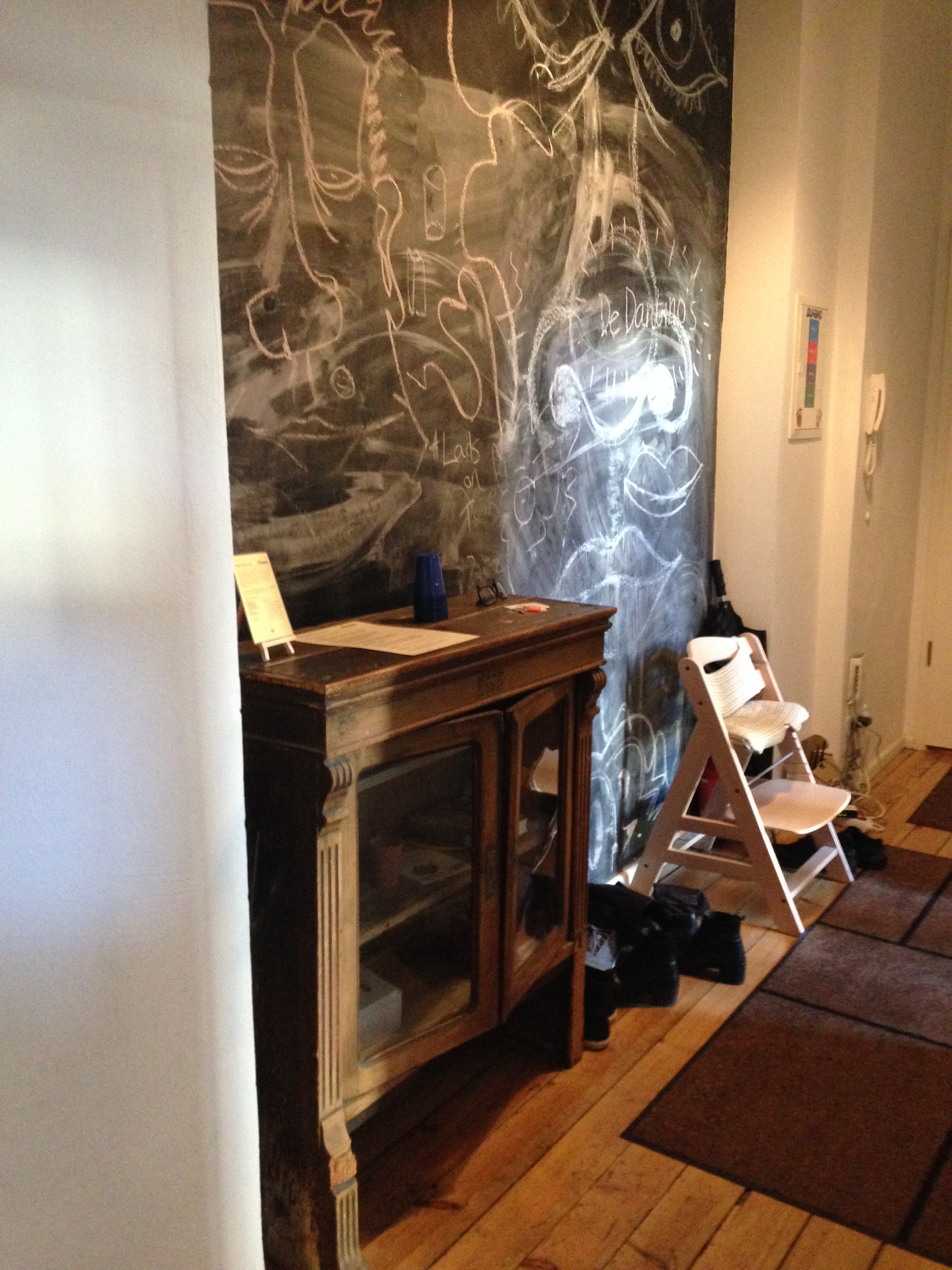 I entreen var der malet med tavlemaling på den ene væg, som i kombination med et gammelt chartol, så rigtig fedt ud.