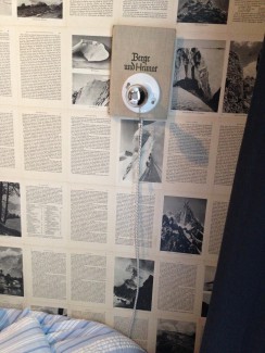 I et andet værelse var der tapetseret med et opslagsværk om bjergegne og dyre- og plantelivet der. Ideen er meget sjov, men den manglede måske noget mere sammenhæng eller tanke bag – til mine vægge. Noget lignende kunne jeg godt tænke mig at prøve af, f.eks. på tøsernes værelser.