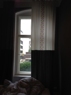 Der var ca. 5 meter til loftet, og gardinerne, der var tilsvarende lange, var sat sammen af flere forskellige stykker stof.