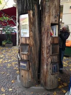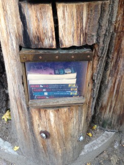 Af andre gode genbrugsinitiativer faldt vi over et helt fantastisk bog-bytte-skab, der var bygget ind i en træstamme. Wow, wow, wow, siger jeg bare!
