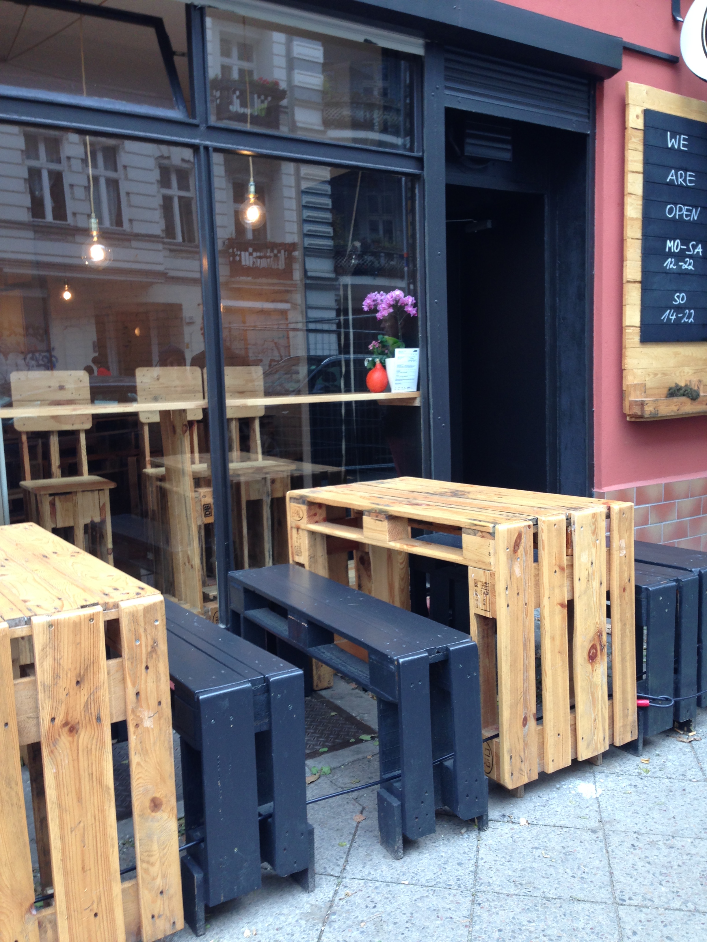 Rigtig mange cafeer og restauranter var indrettet med genbrug. Her en udendørs borde-bænke-løsning bygget af paller.