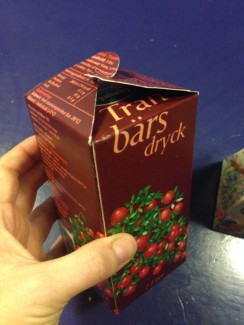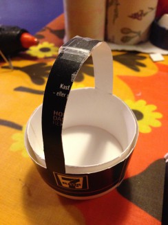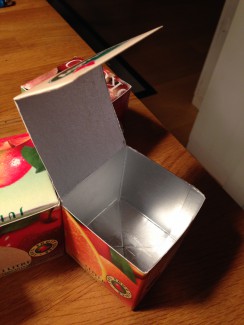 Hankene er klippet af mælkekartonen sådan her og efterfølgende samlet med tape: